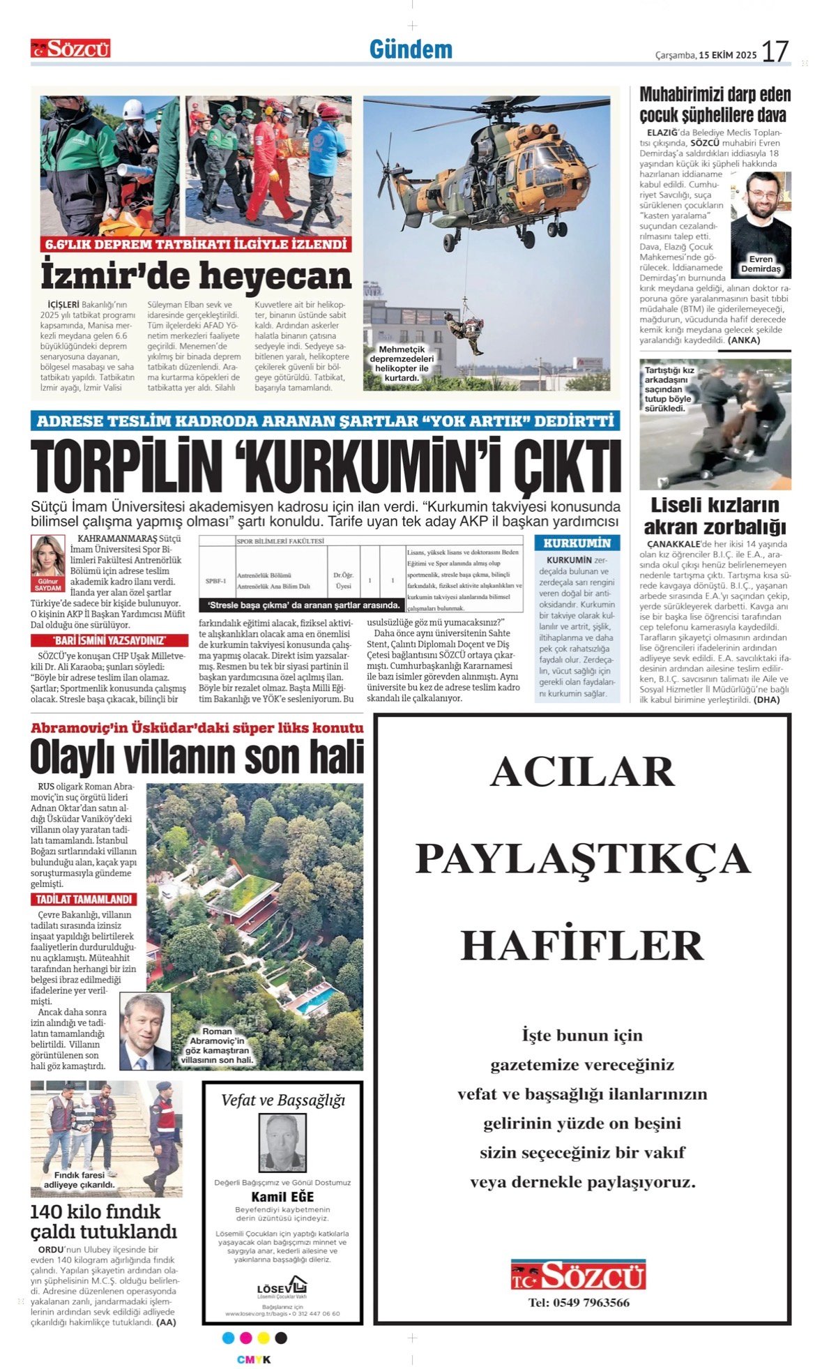 Sözcü Bugünkü Vefat, Başsağlığı, Anma İlanları 15.10.2025;
