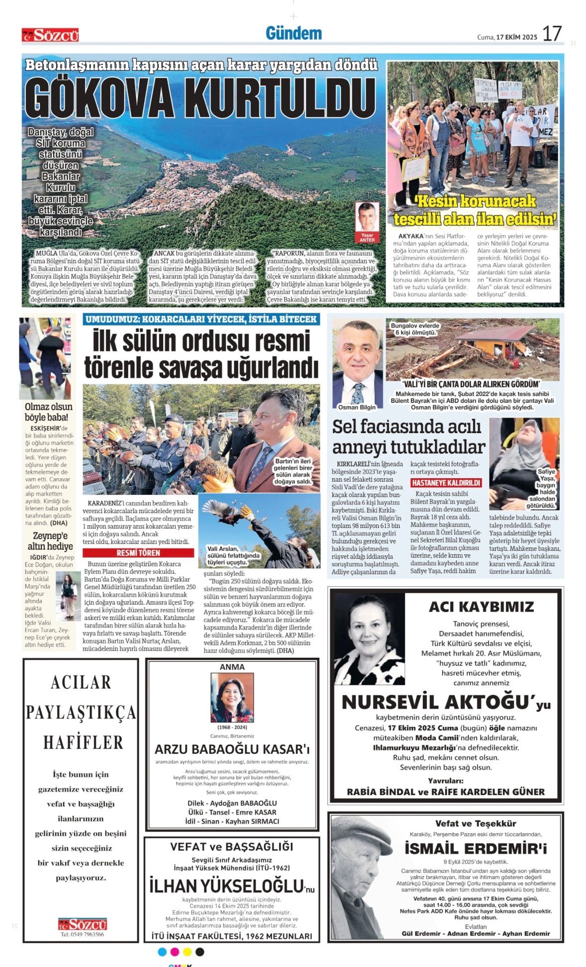 Sözcü Bugünkü Vefat, Başsağlığı, Anma İlanları 17.10.2025;