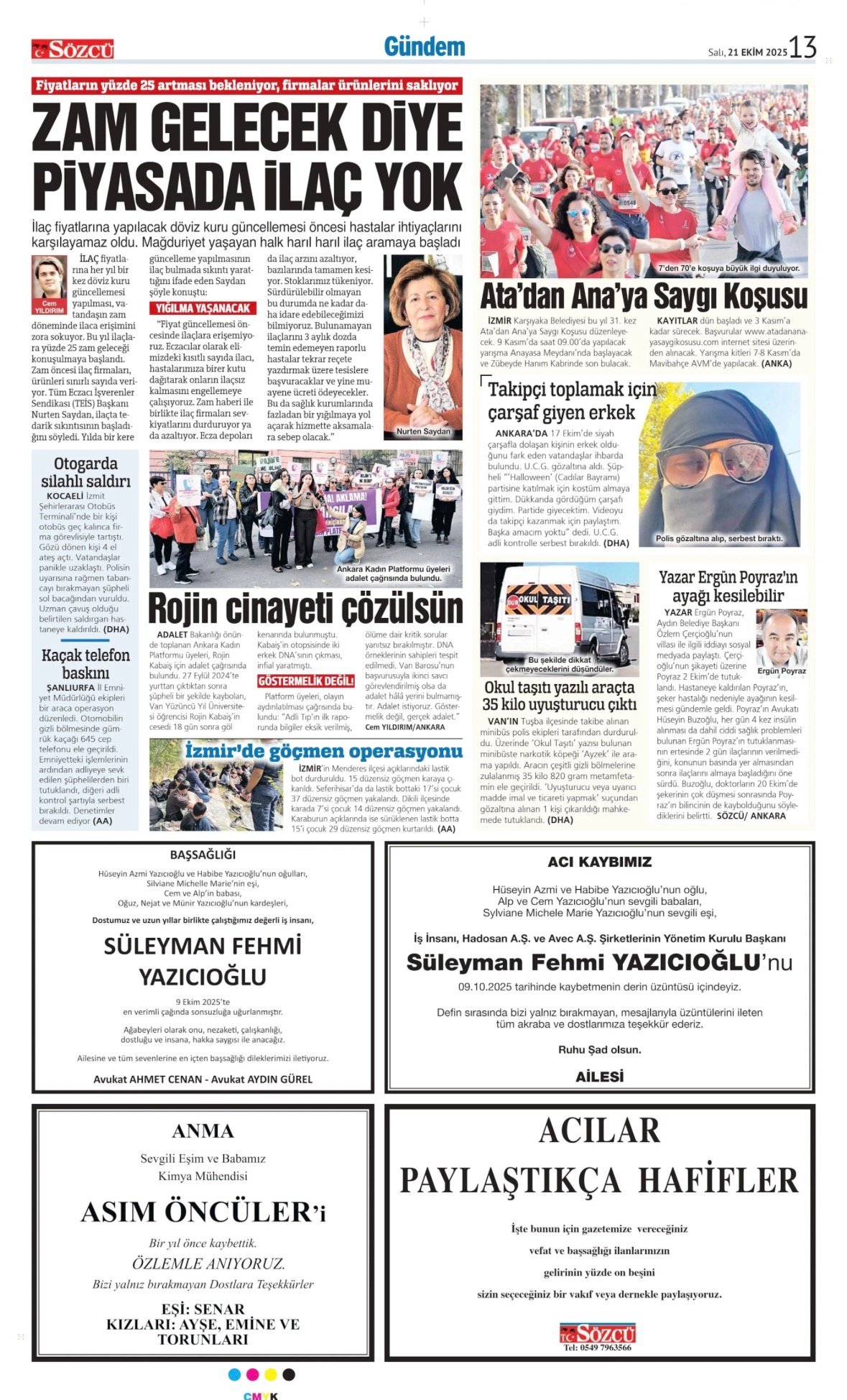 Sözcü Bugünkü Vefat, Başsağlığı, Anma İlanları 21.10.2025;