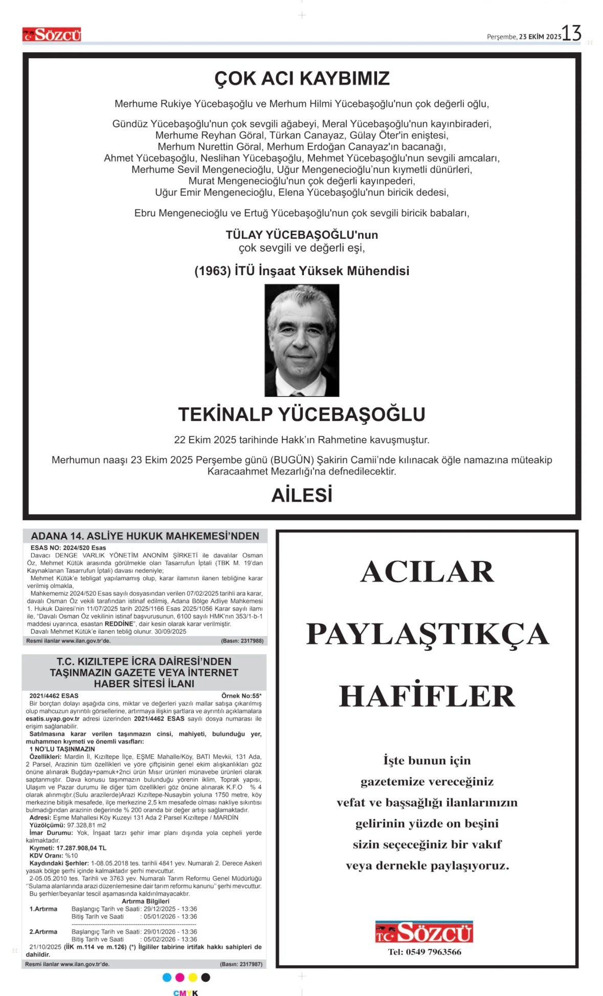 Sözcü Bugünkü Vefat, Başsağlığı, Anma İlanları 23.10.2025;