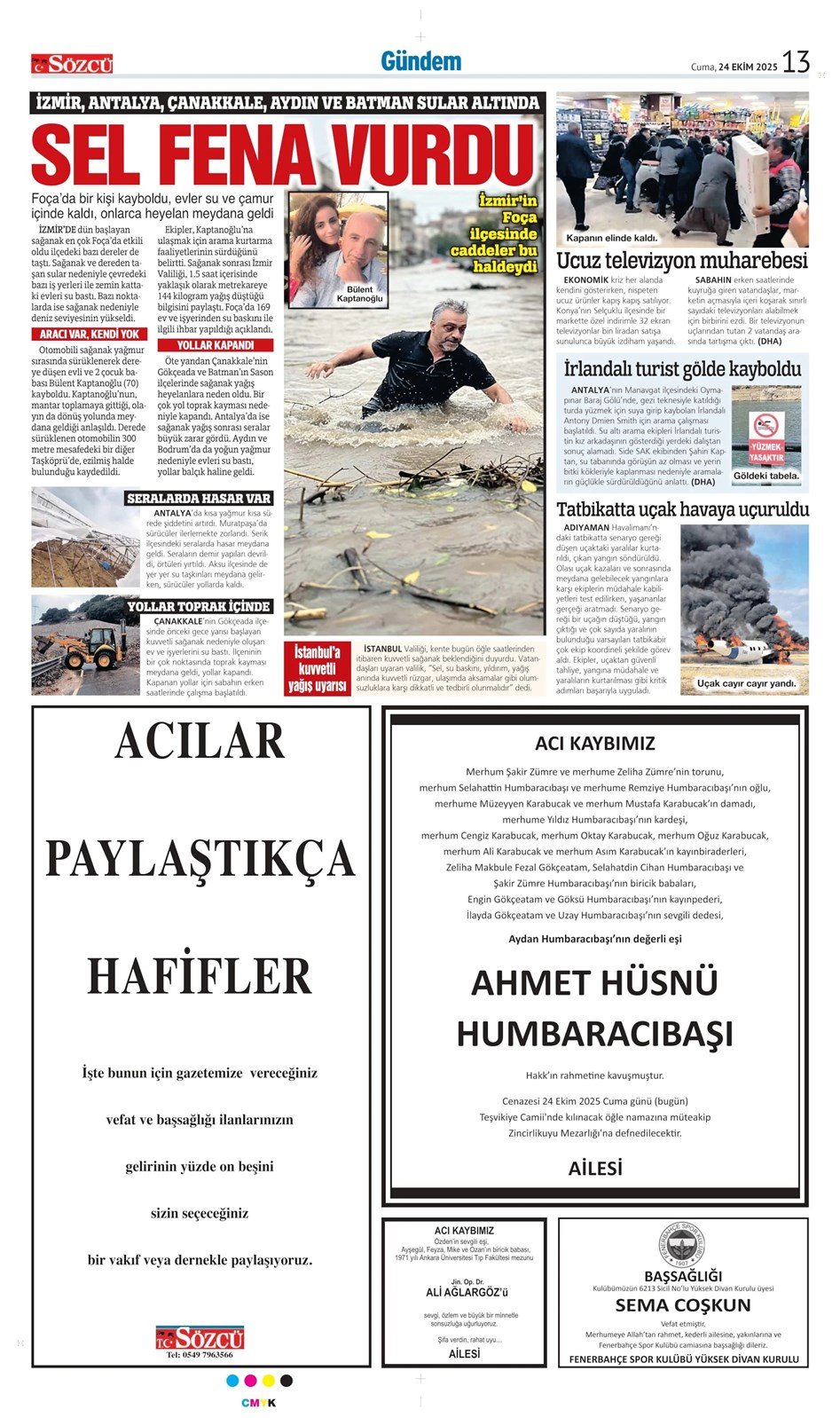 Sözcü Bugünkü Vefat, Başsağlığı, Anma İlanları 24.10.2025;