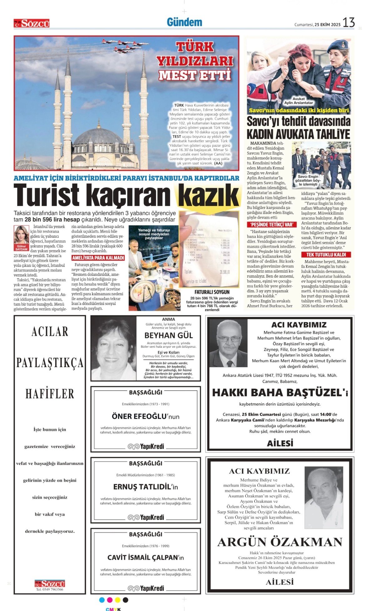 Sözcü Bugünkü Vefat, Başsağlığı, Anma İlanları 25.10.2025;
