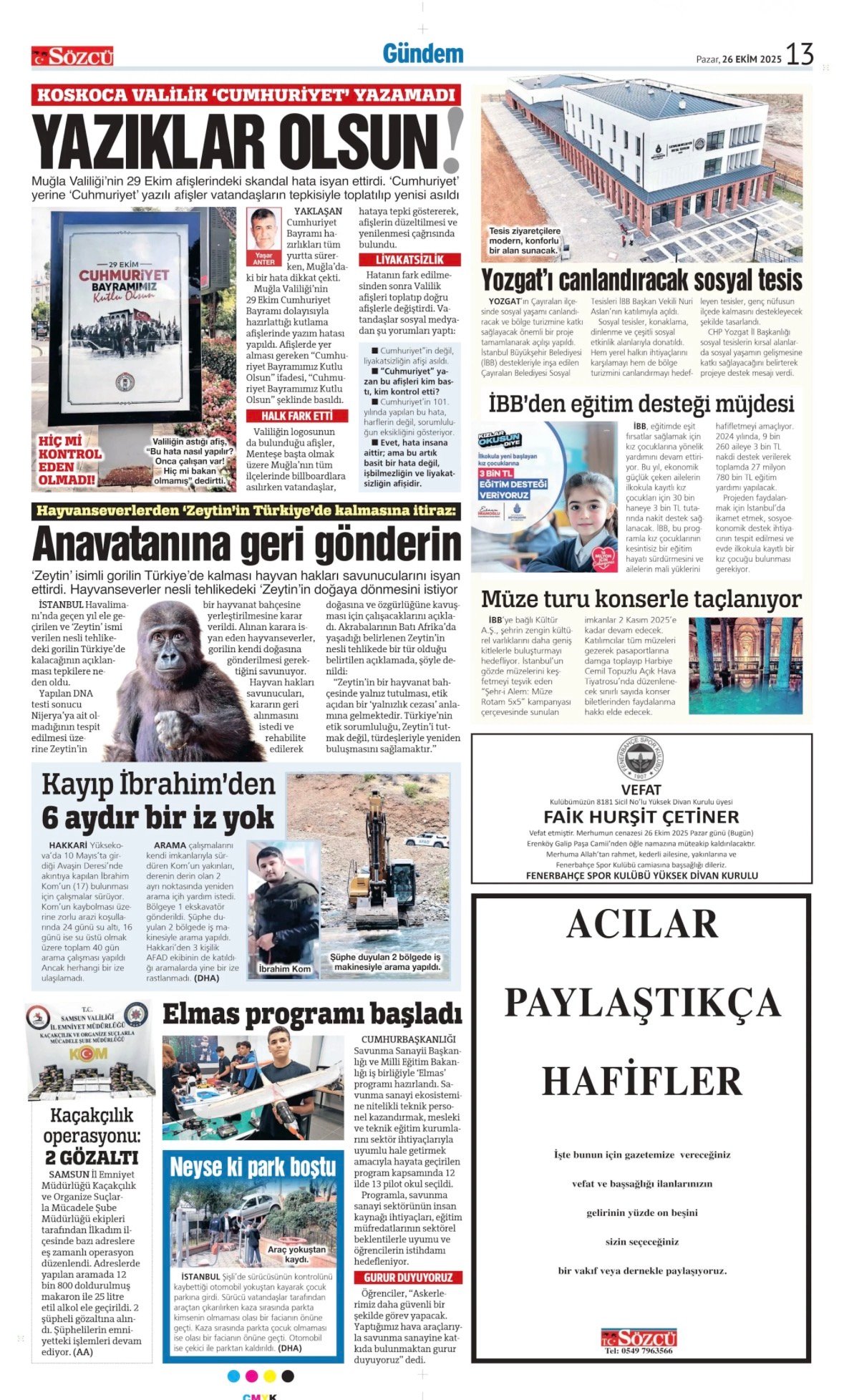 Sözcü Bugünkü Vefat, Başsağlığı, Anma İlanları 26.10.2025;