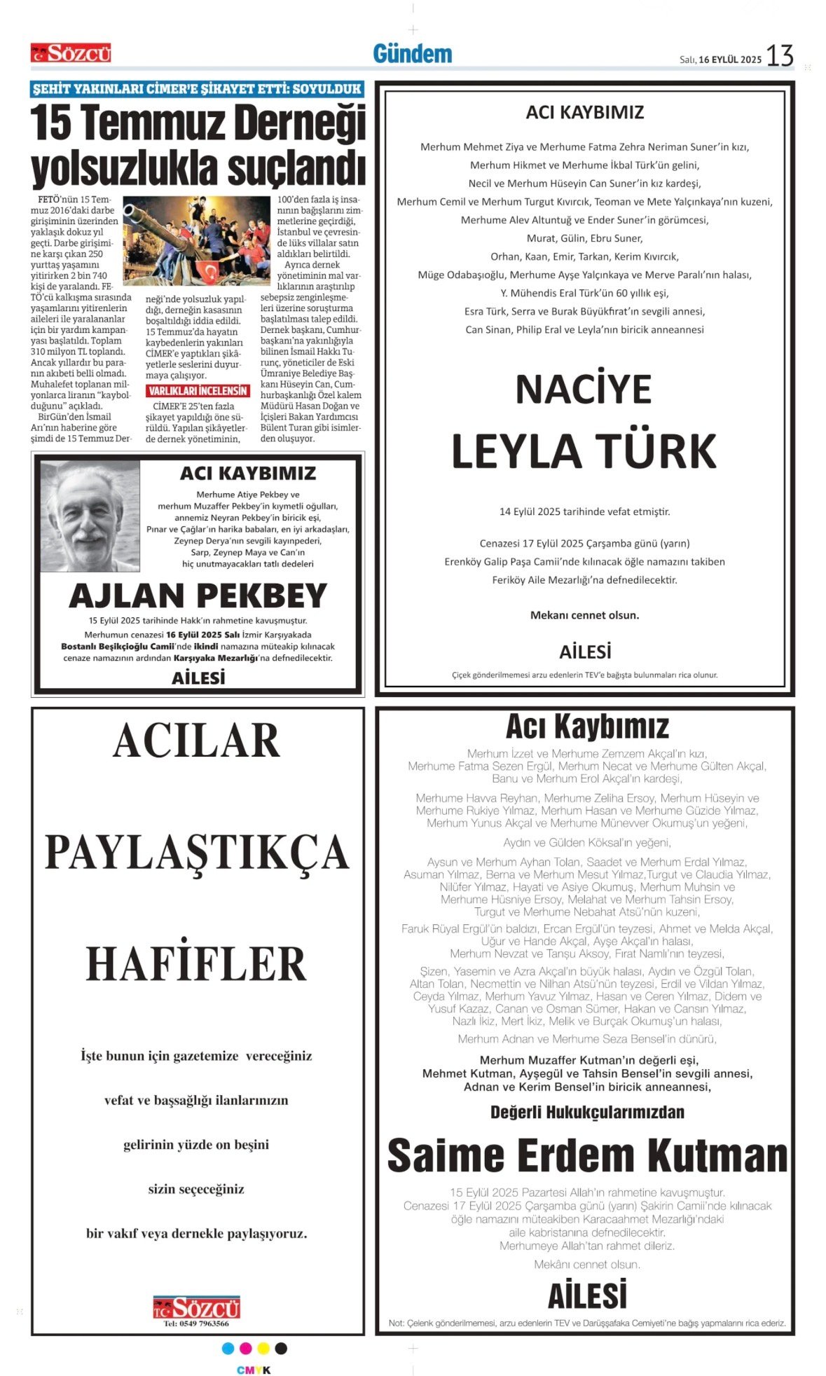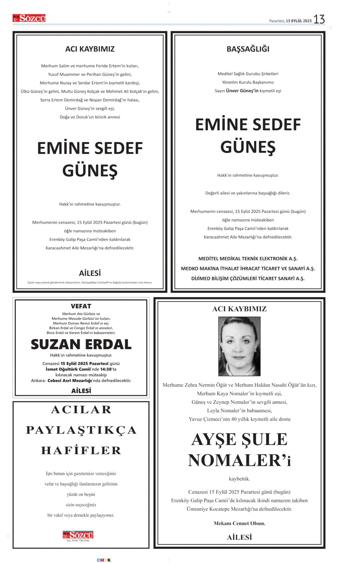 Sözcü Bugünkü Vefat İlanlar 15.9.2025;