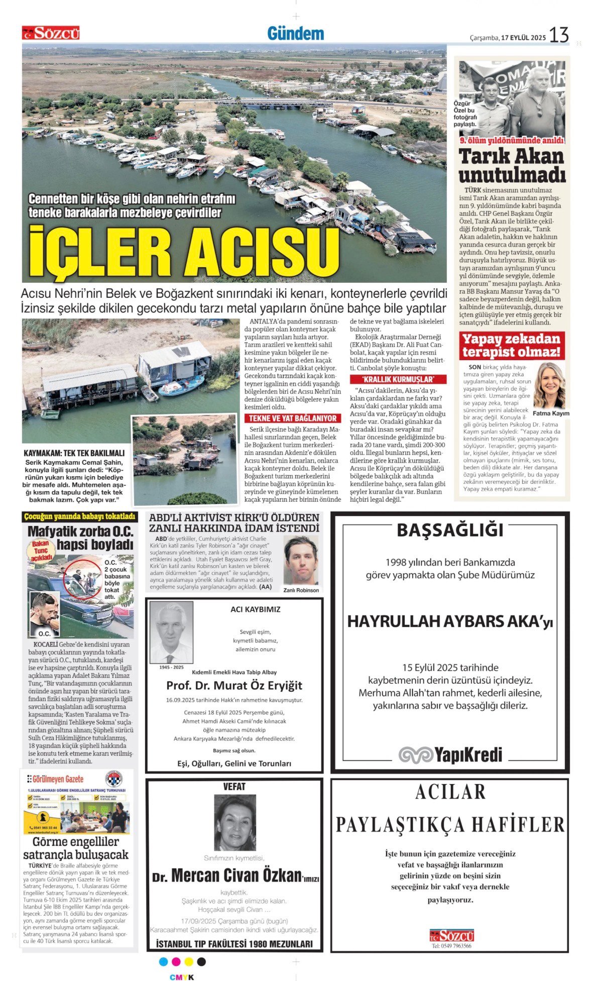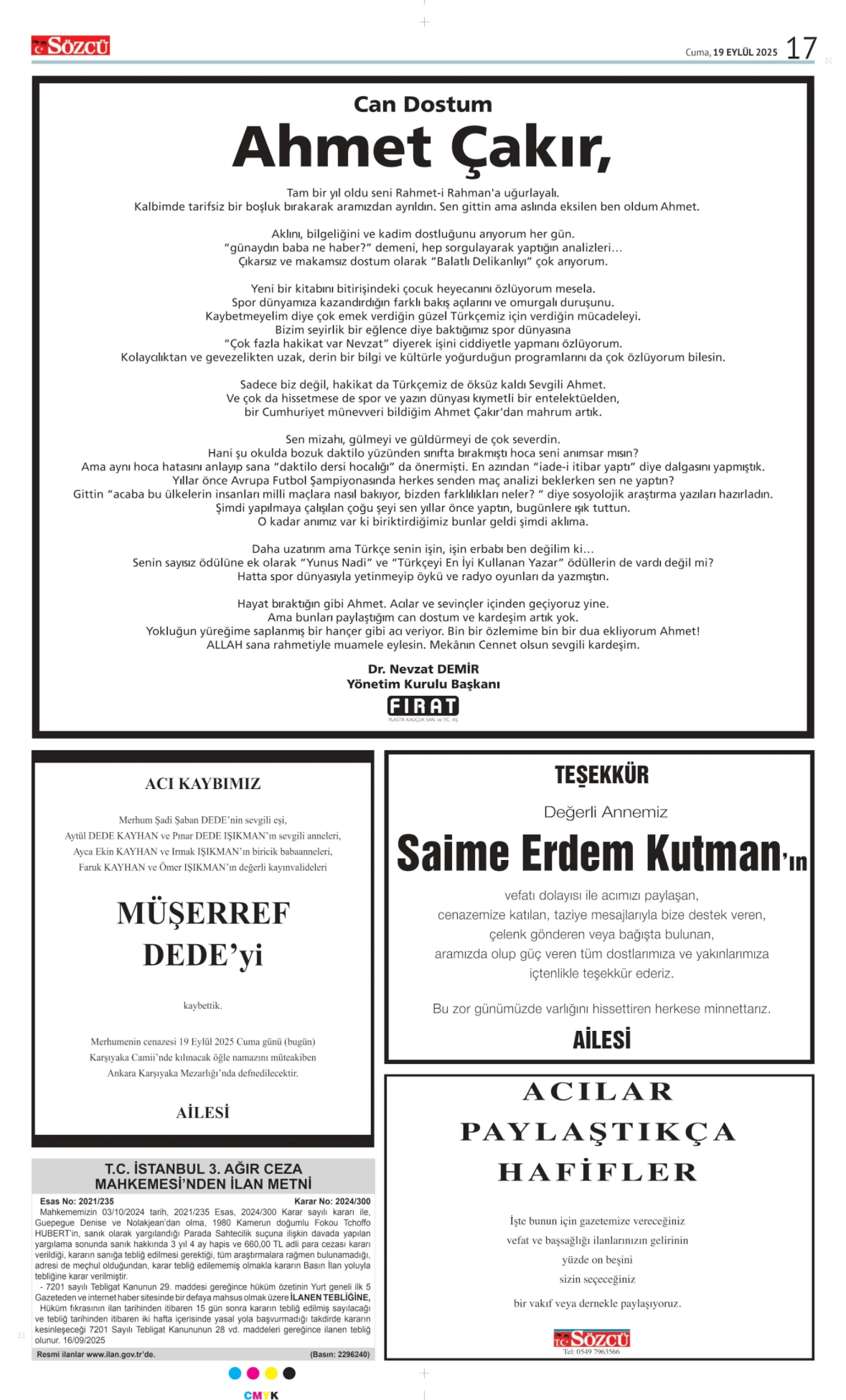 Sözcü Bugünkü Vefat, Başsağlığı, Anma İlanları 17.9.2025;