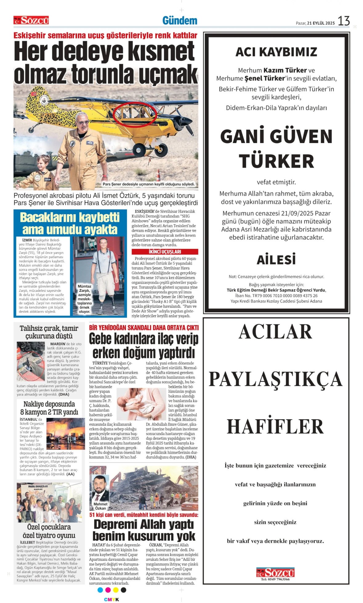 Sözcü Bugünkü Vefat, Başsağlığı, Anma İlanları 21.9.2025;