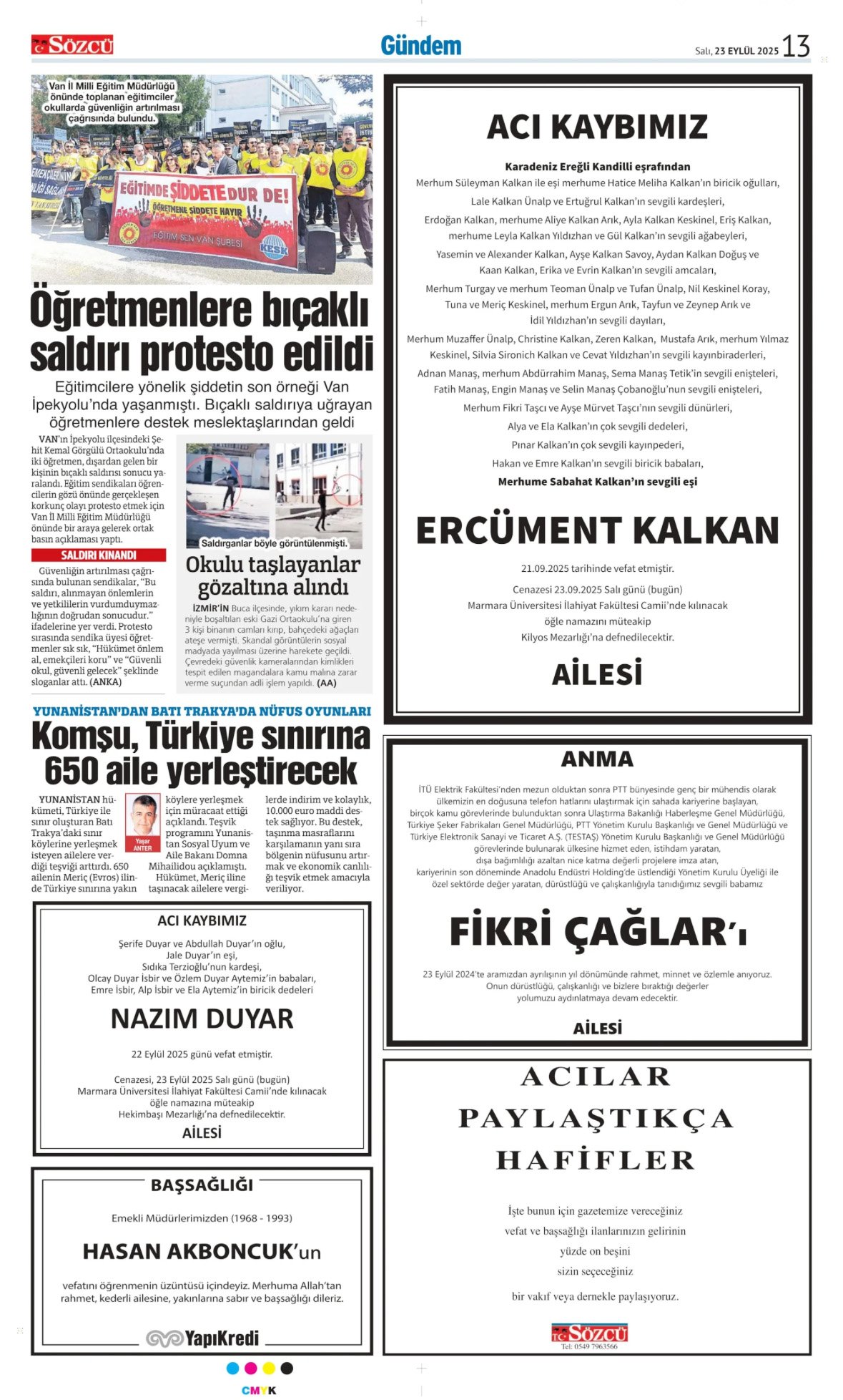 Sözcü Bugünkü Vefat, Başsağlığı, Anma İlanları 23.9.2025;