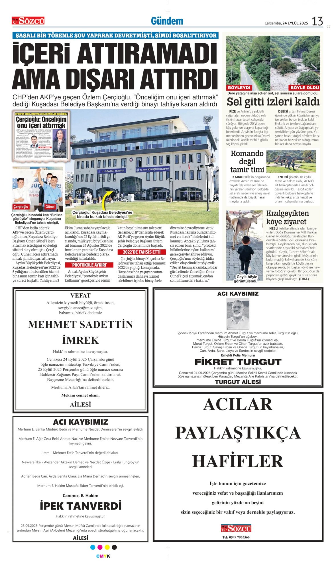 Sözcü Bugünkü Vefat, Başsağlığı, Anma İlanları 24.9.2025;