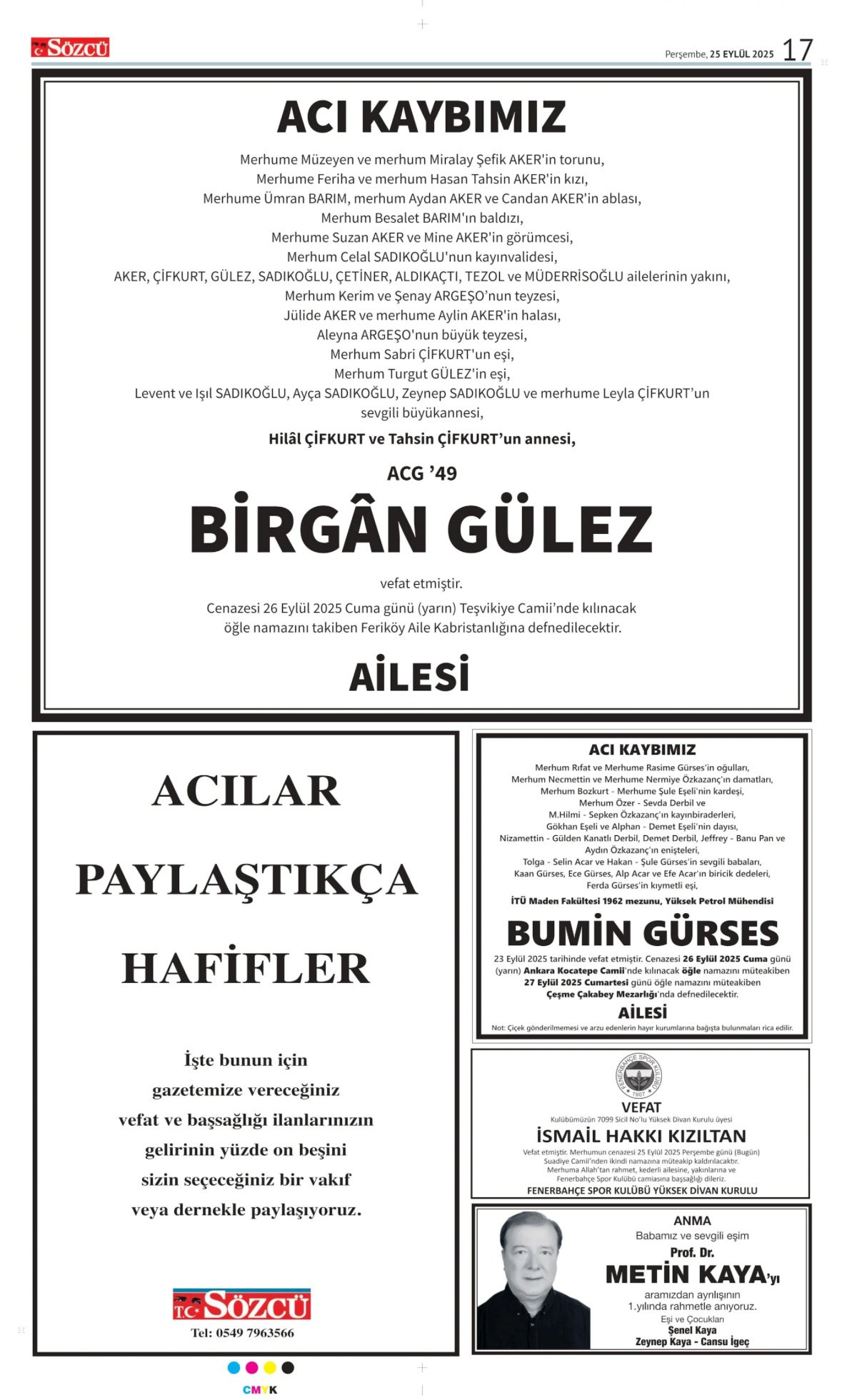 Sözcü Bugünkü Vefat, Başsağlığı, Anma İlanları 25.9.2025;