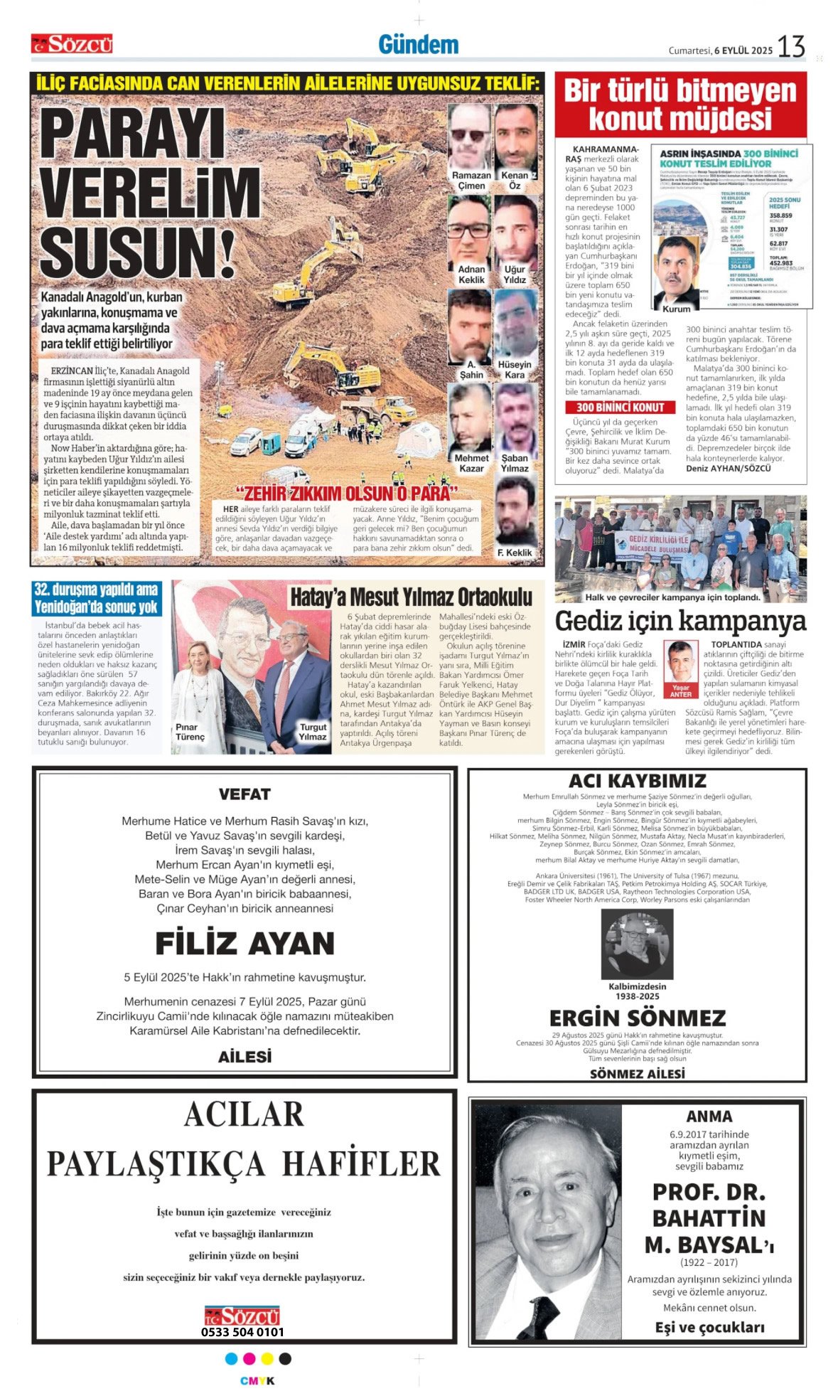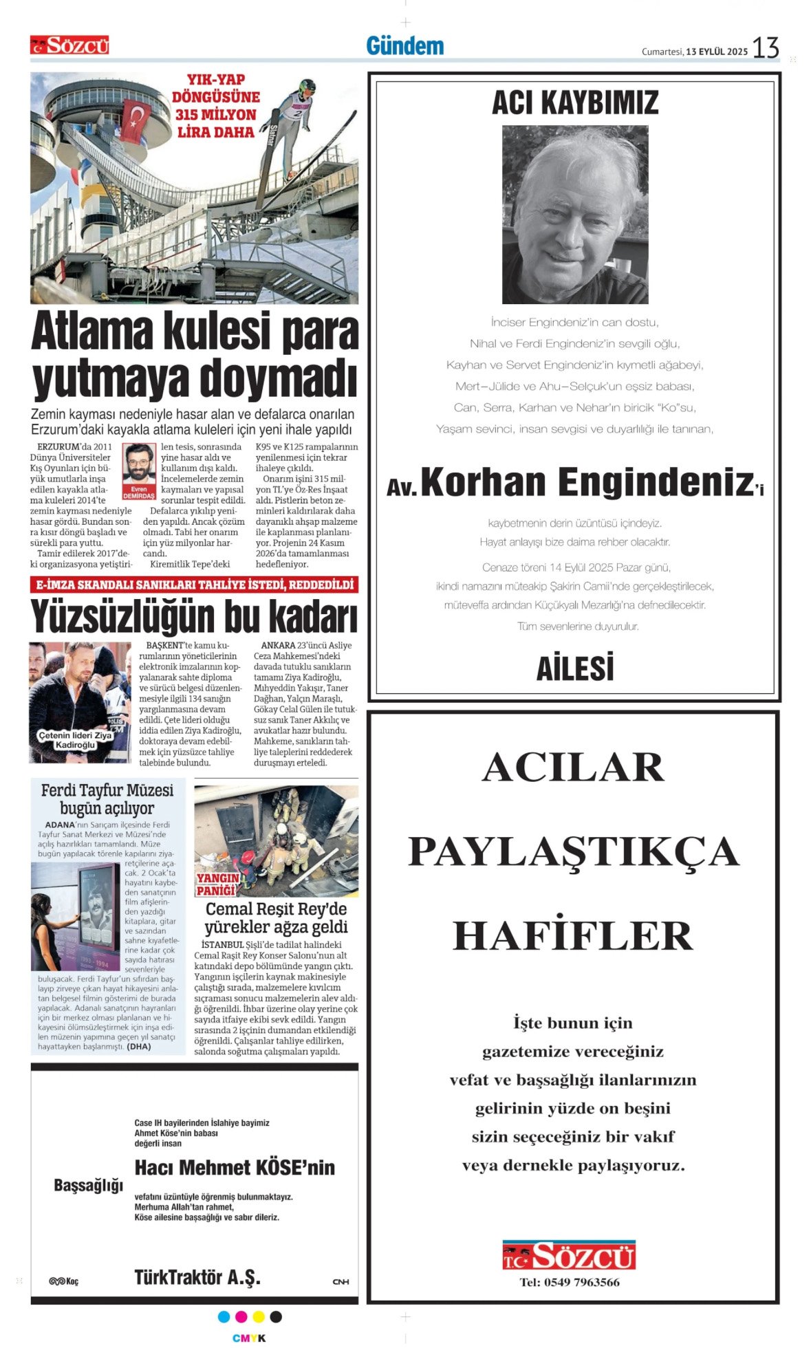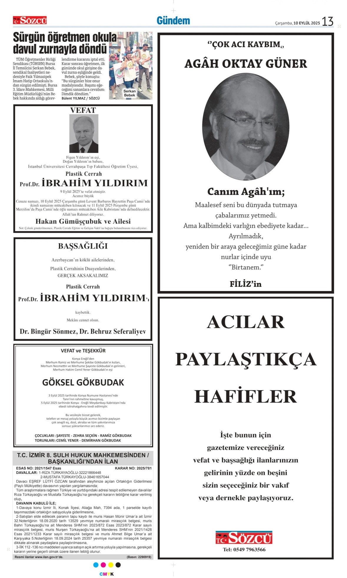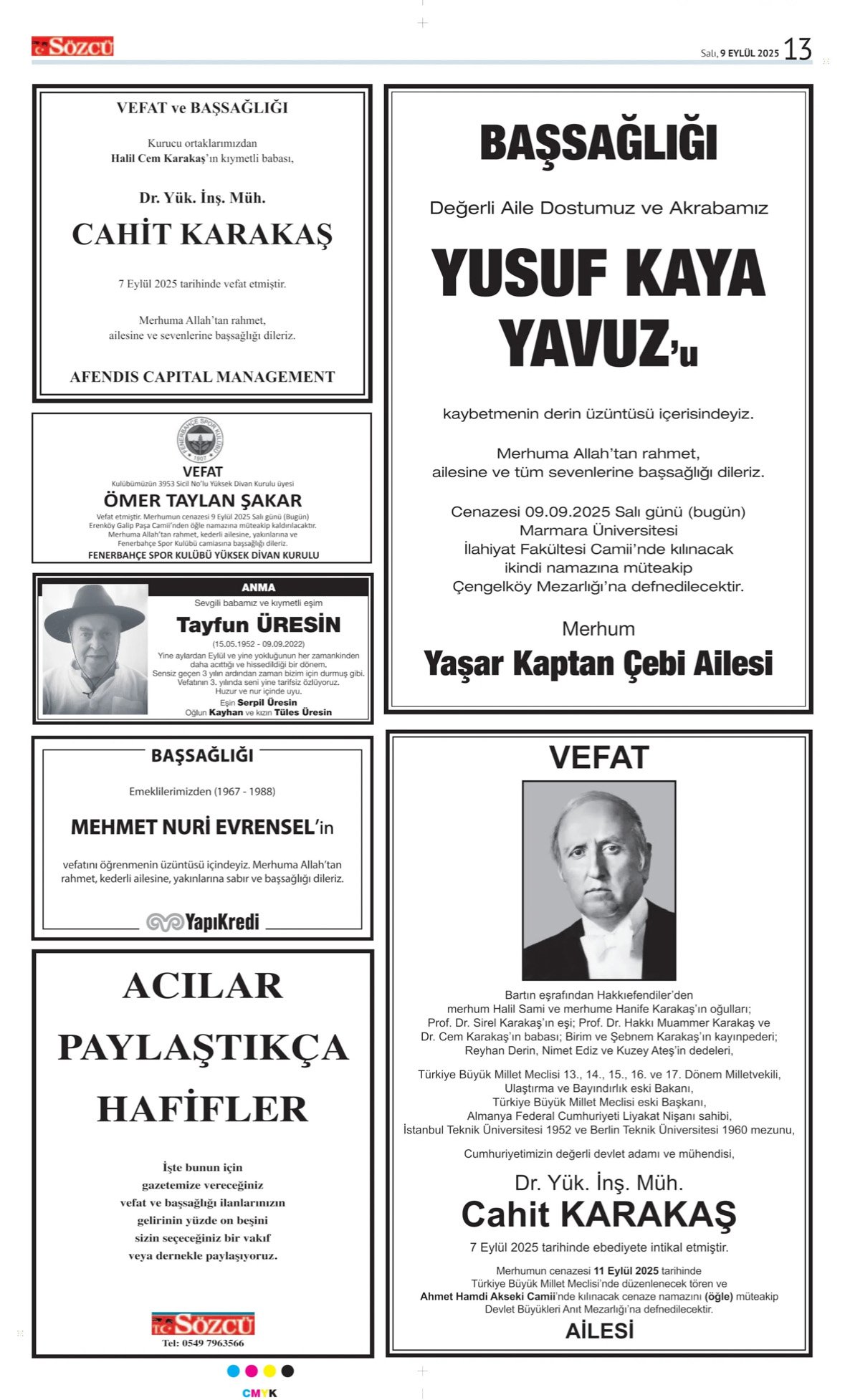 Sözcü Bugünkü Vefat İlanlar 13.9.2025;
