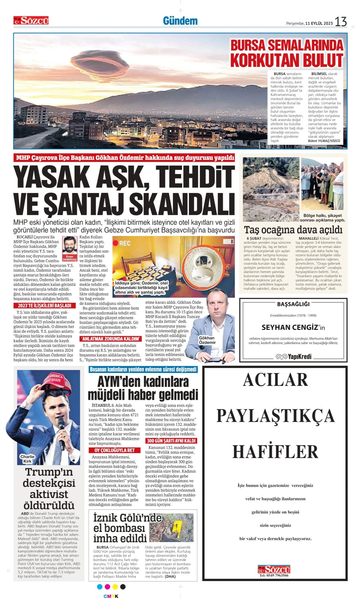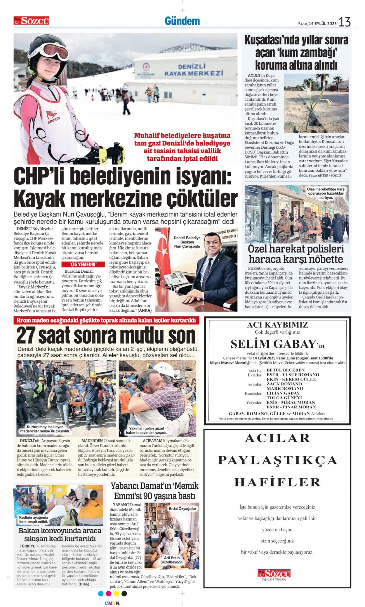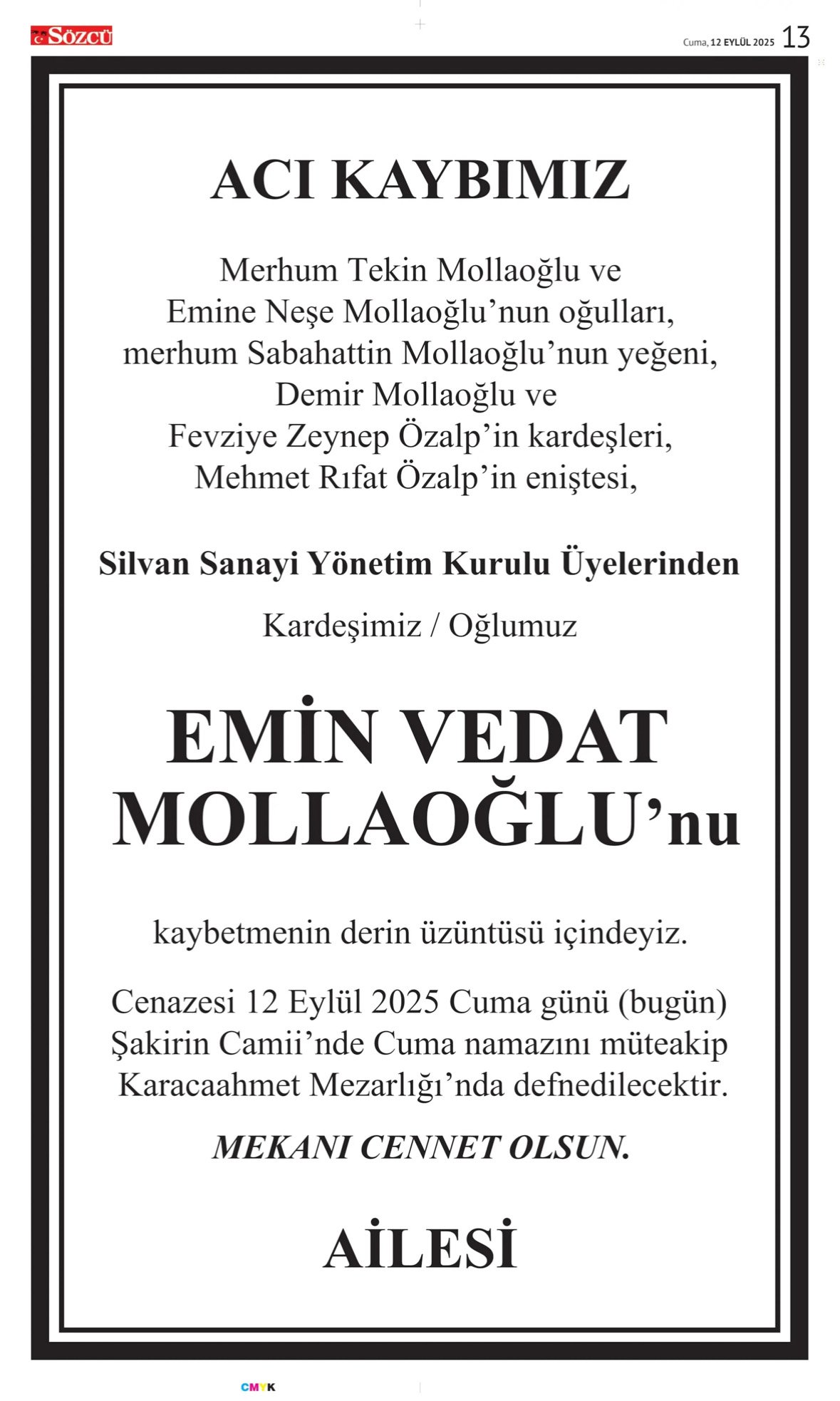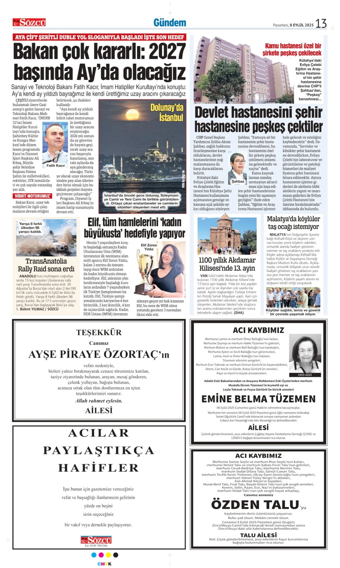 Sözcü Bugünkü Vefat İlanlar 13.9.2025;