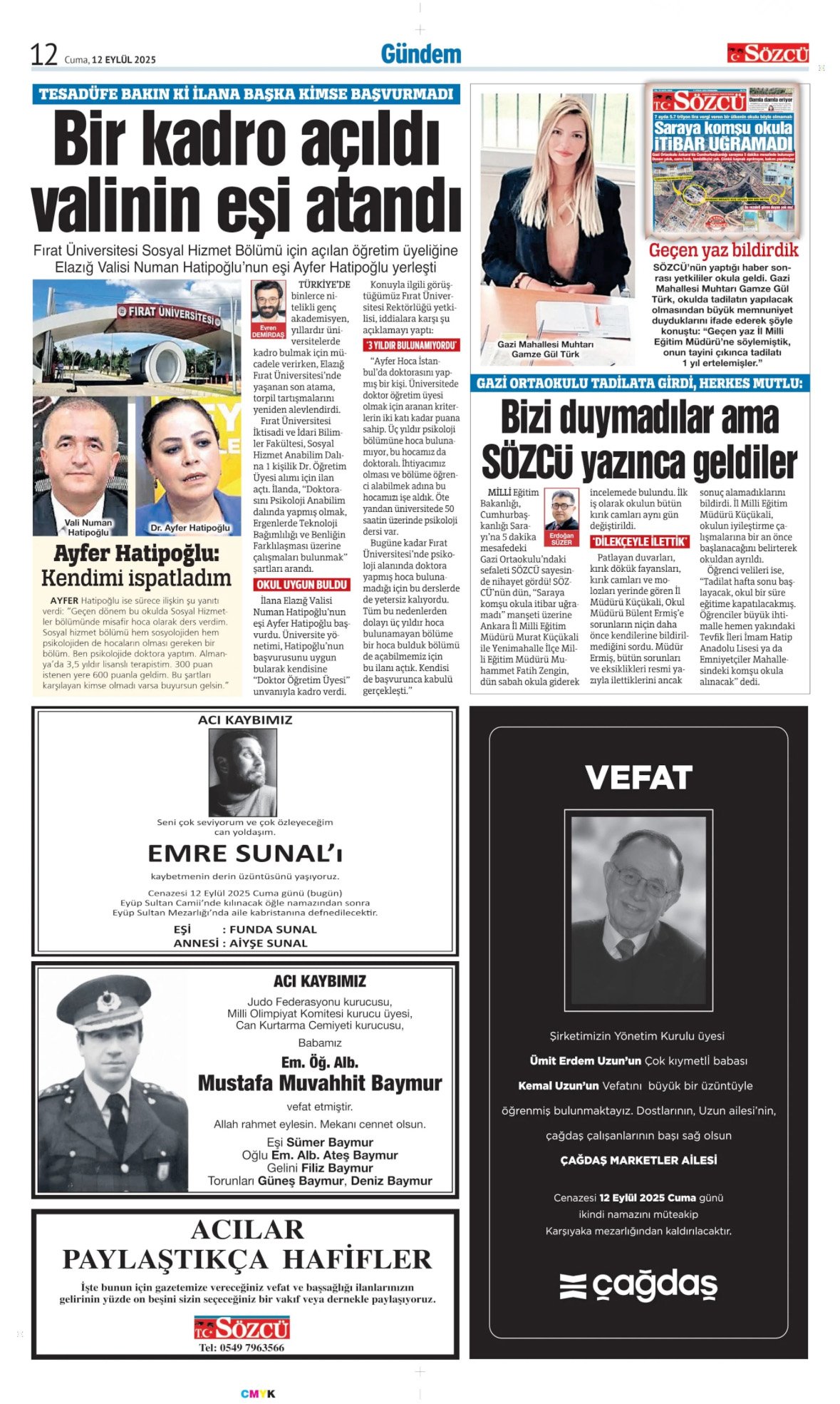 Sözcü Bugünkü Vefat İlanlar 12.9.2025;