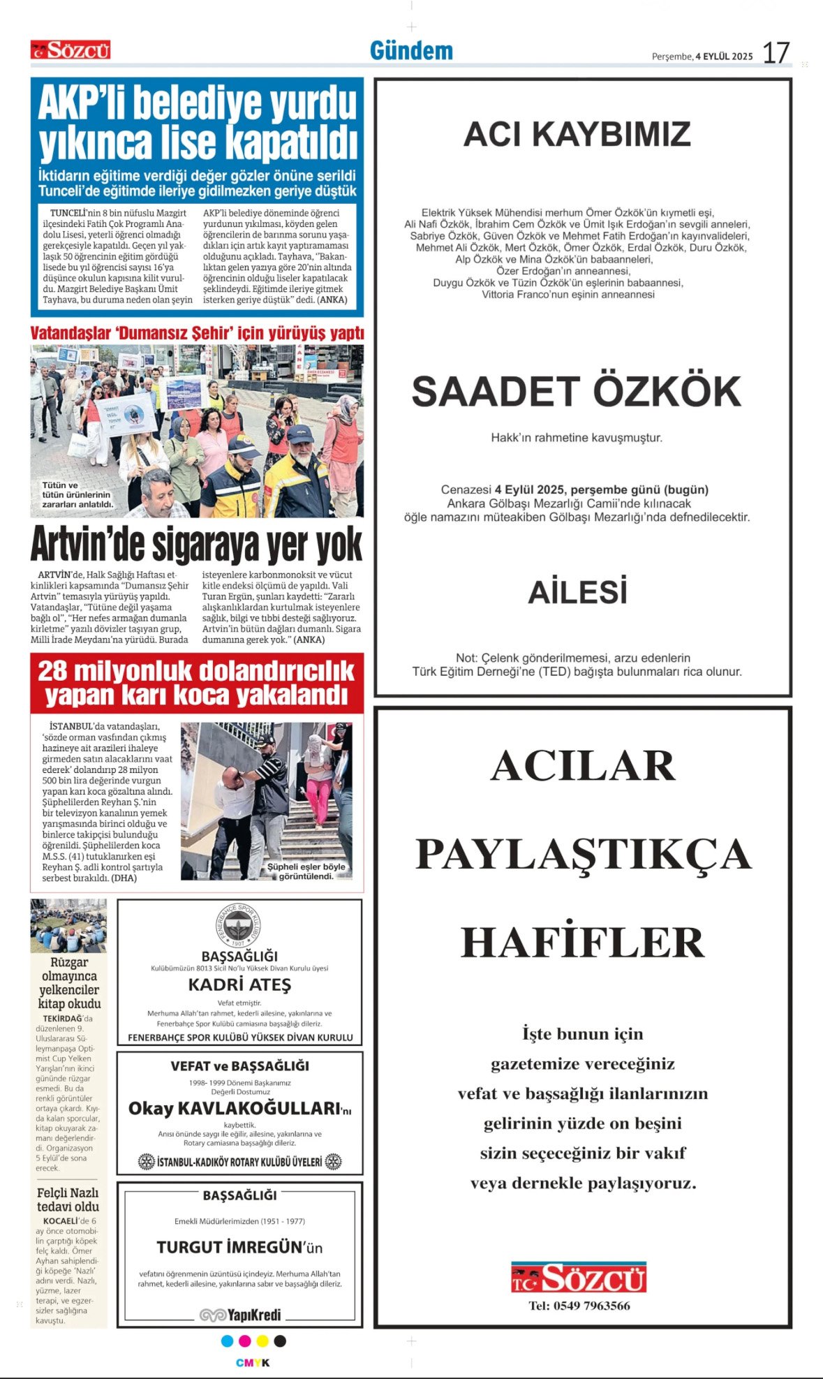 Sözcü Bugünkü Vefat İlanlar 4.9.2025;