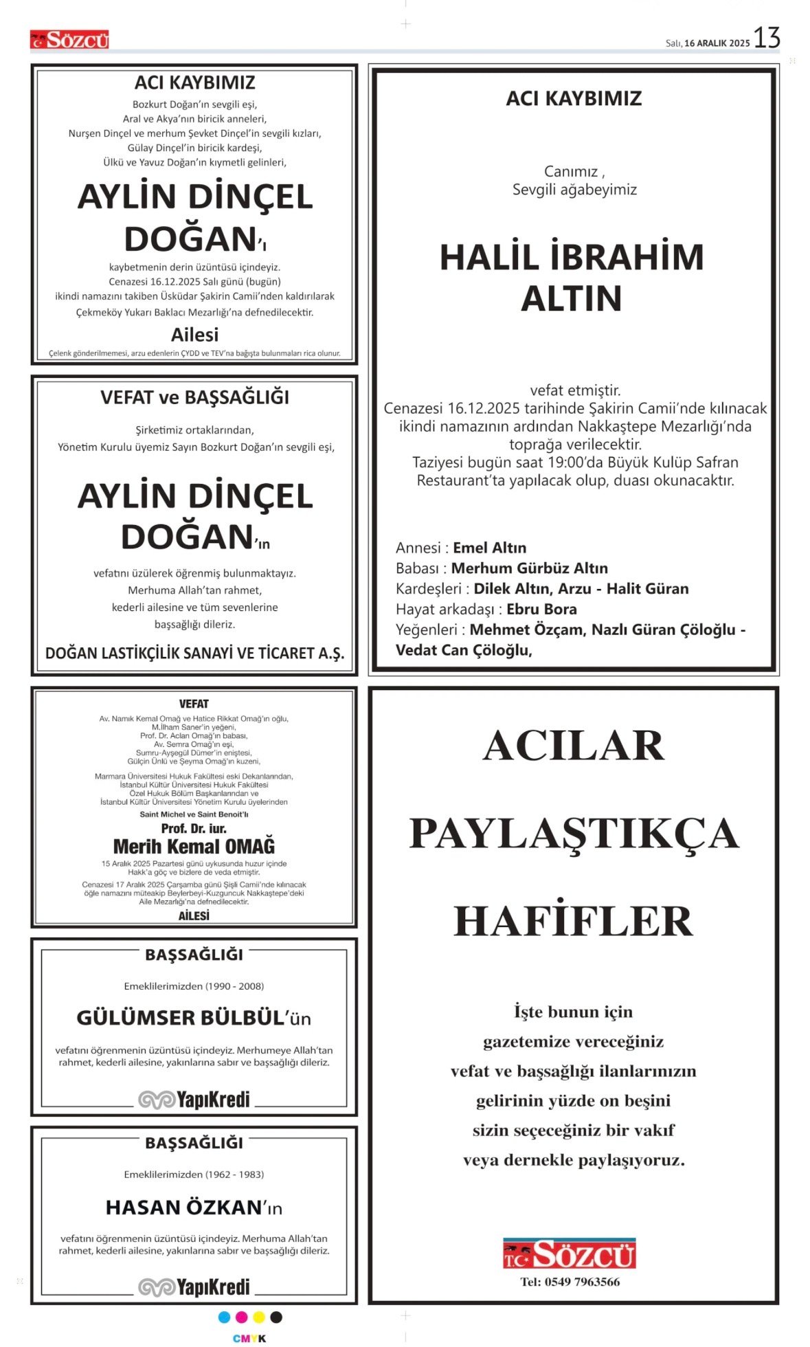 Sözcü Bugünkü Vefat (Ölüm) – Başsağlığı – Anma – Teşekkür – Mevlit İlanları-16.12.2025