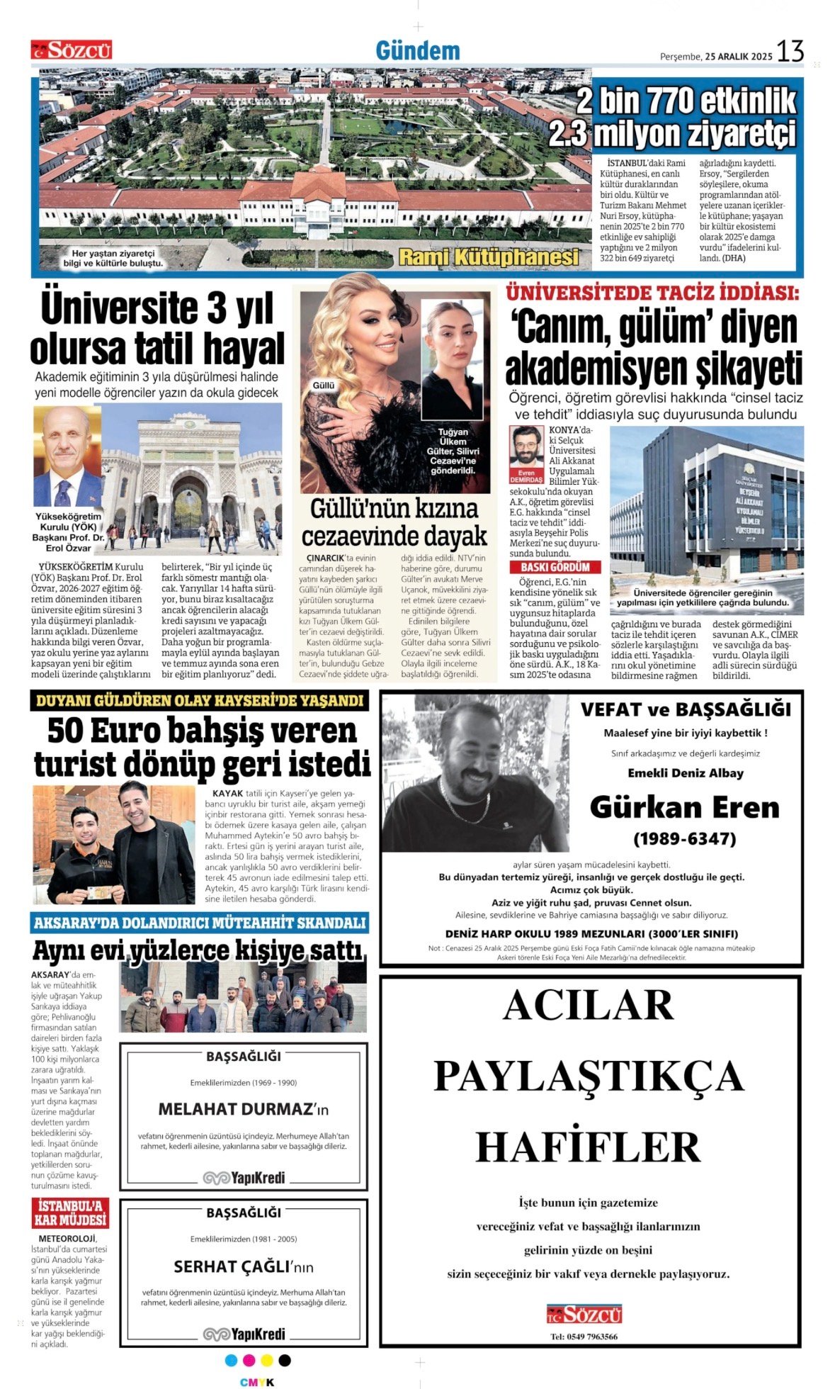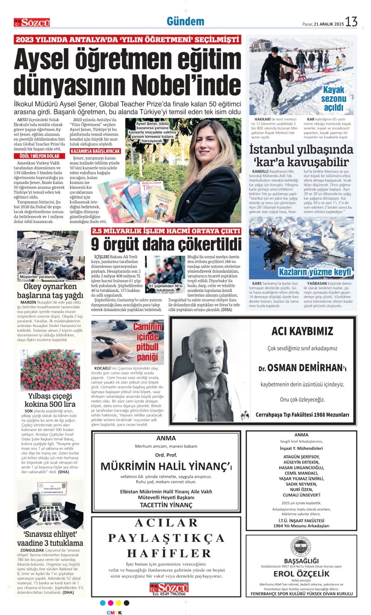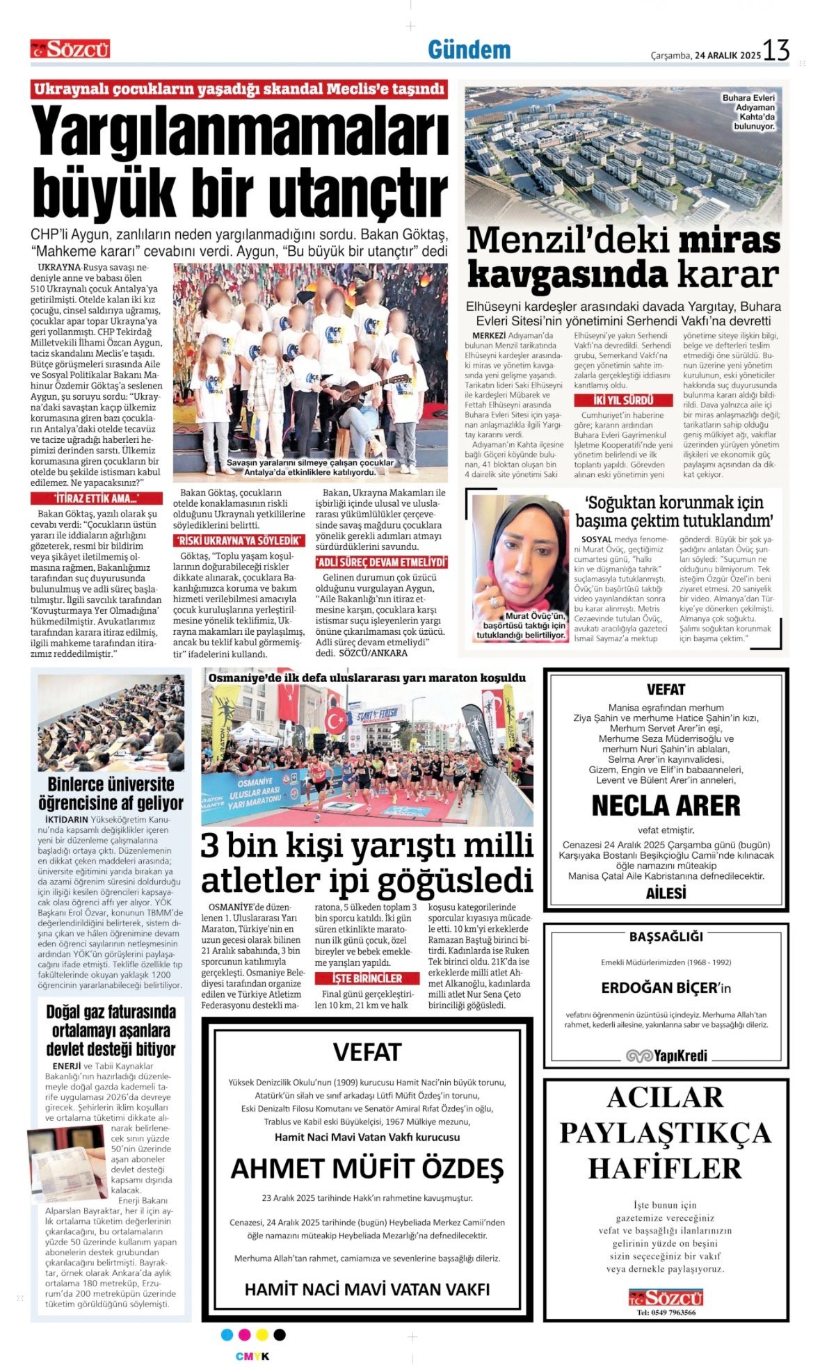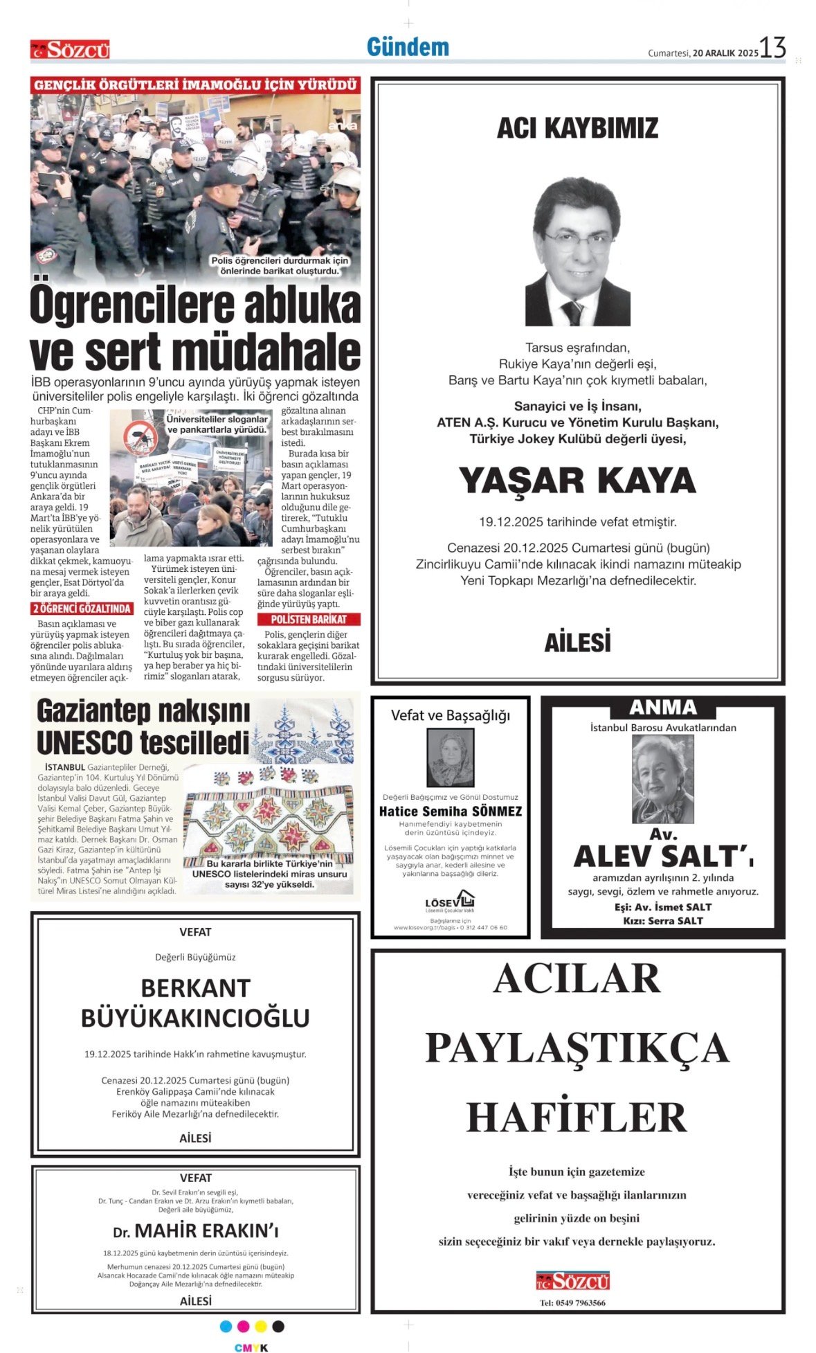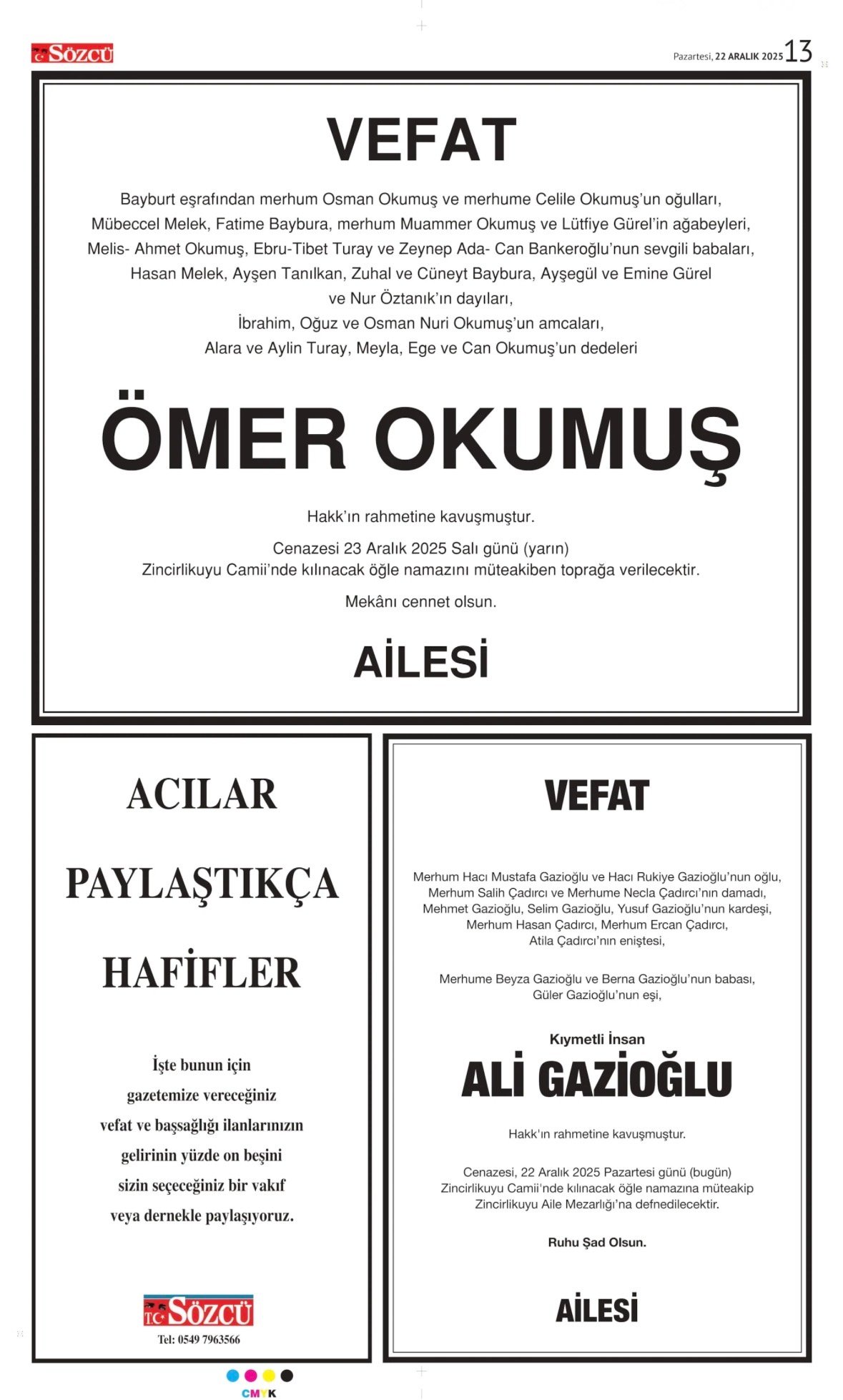 Sözcü Bugünkü Vefat İlan- Başsağlığı İlanı- Anma İlanları ve Arşiv Sayfalar. 22.12.2025