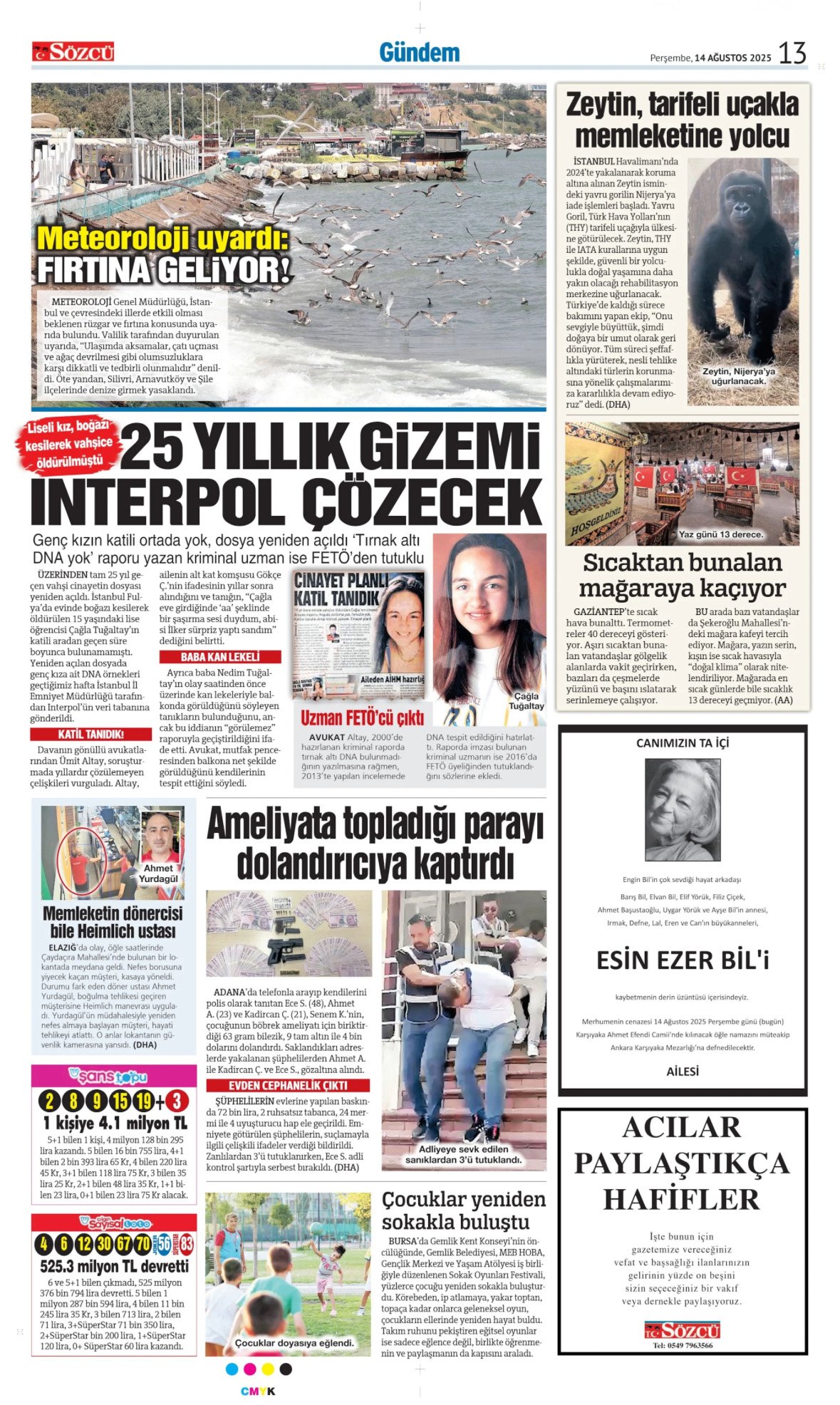 Sözcü Bugünkü Vefat İlanlar 14.8.2025;