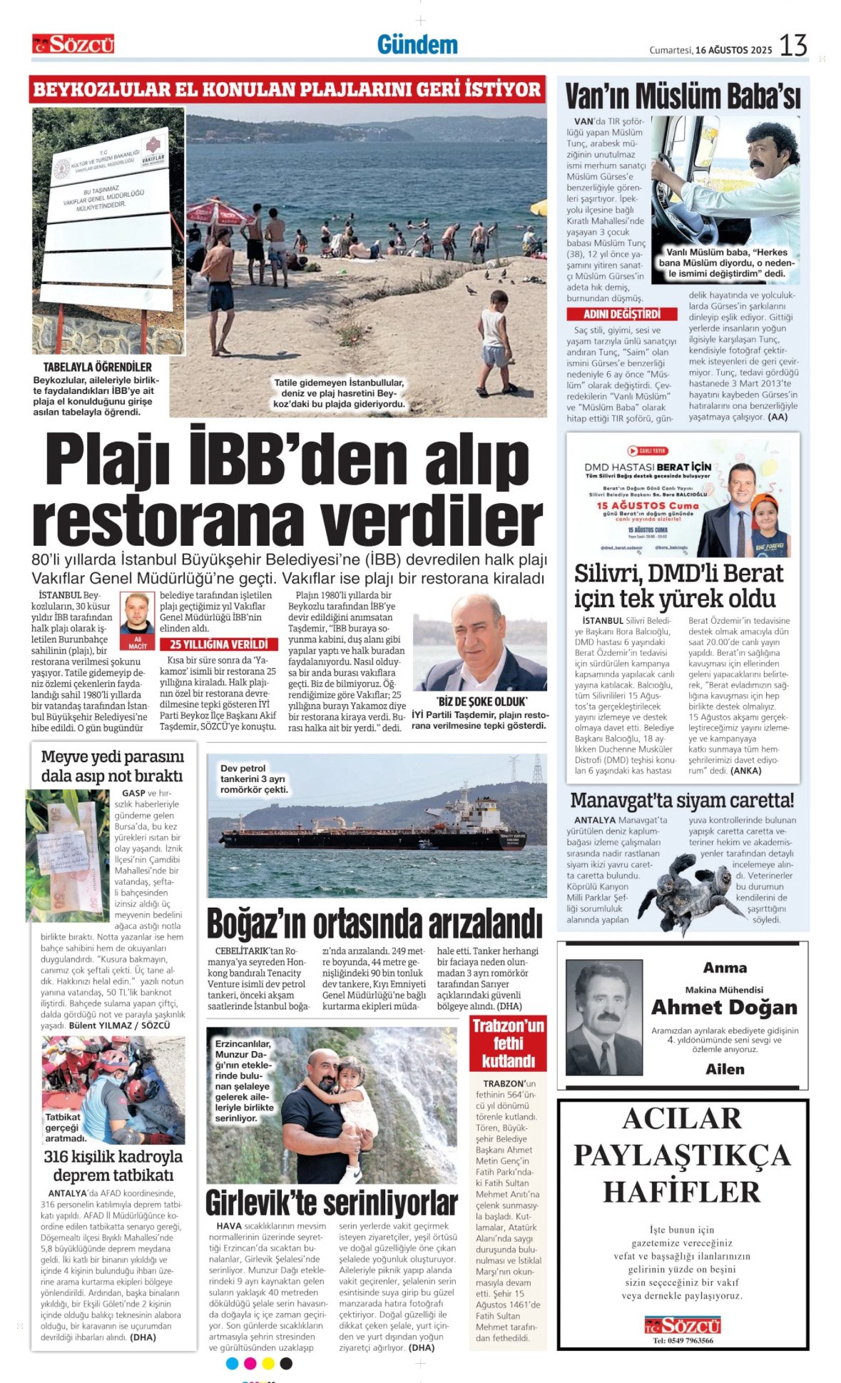 Sözcü Bugünkü Vefat İlanlar 16.8.2025;
