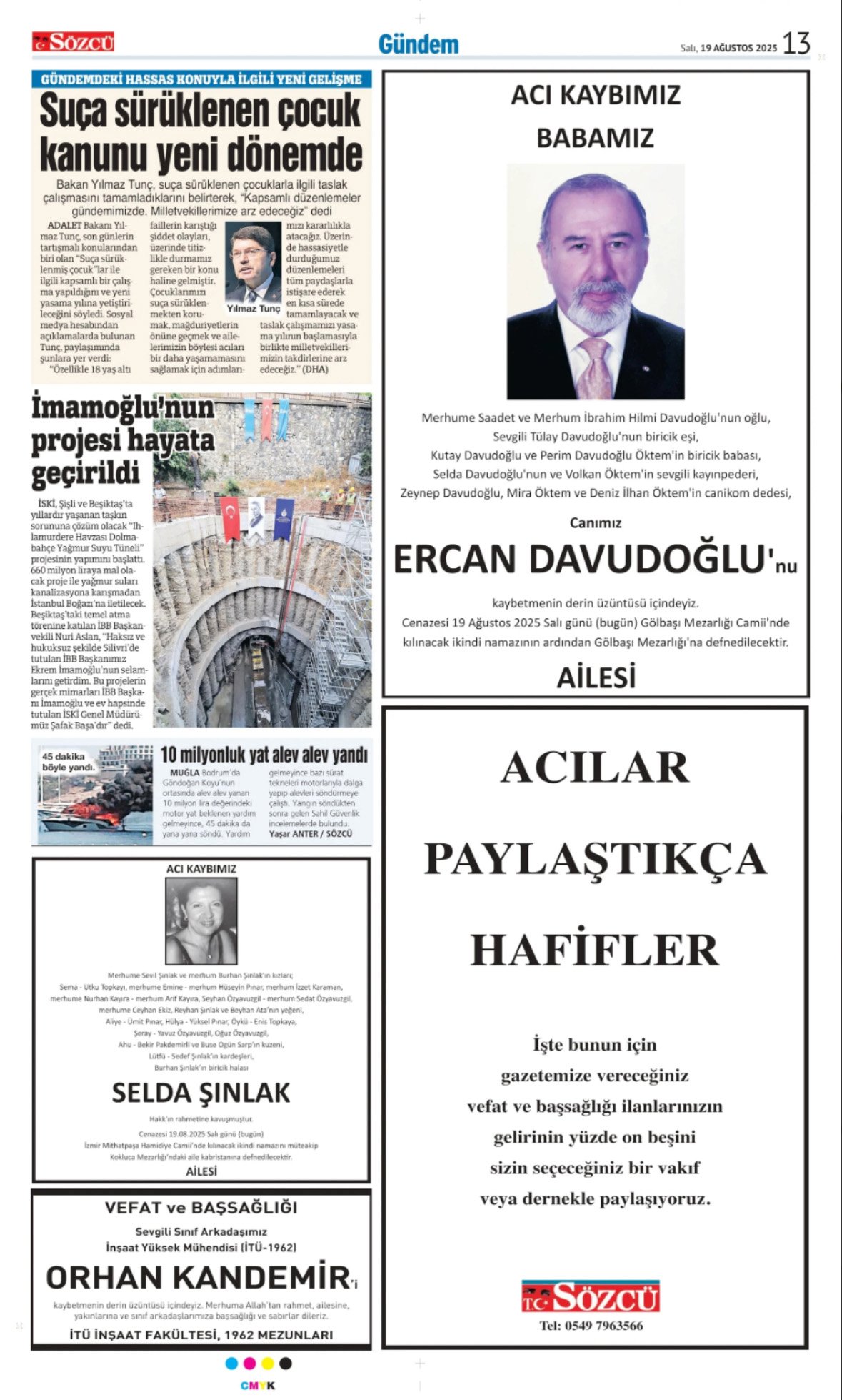 Sözcü Bugünkü Vefat İlanlar 19.8.2025;