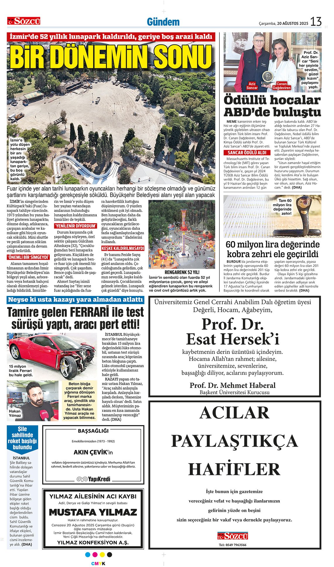 Sözcü Bugünkü Vefat İlanlar 20.8.2025;
