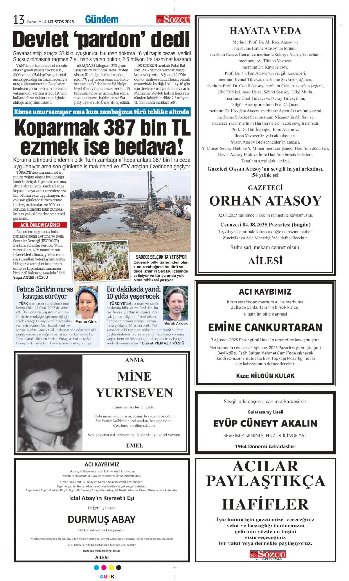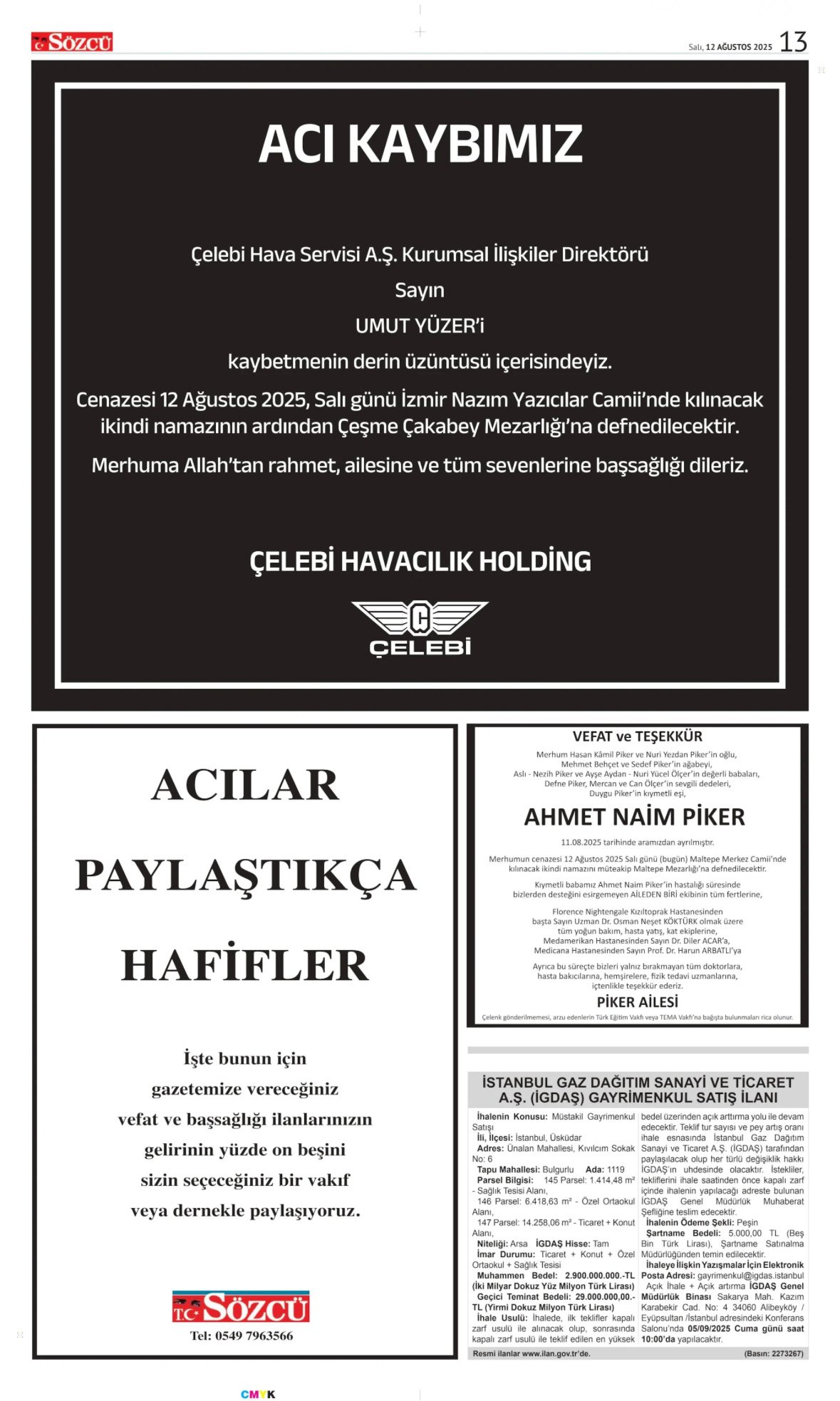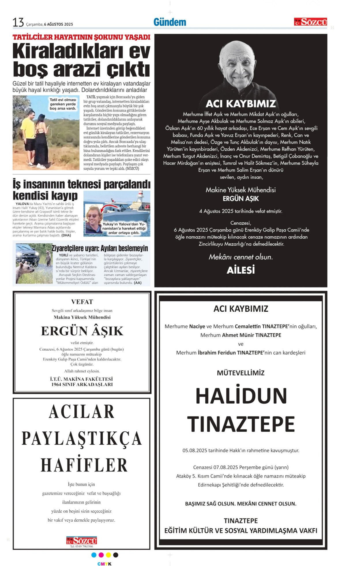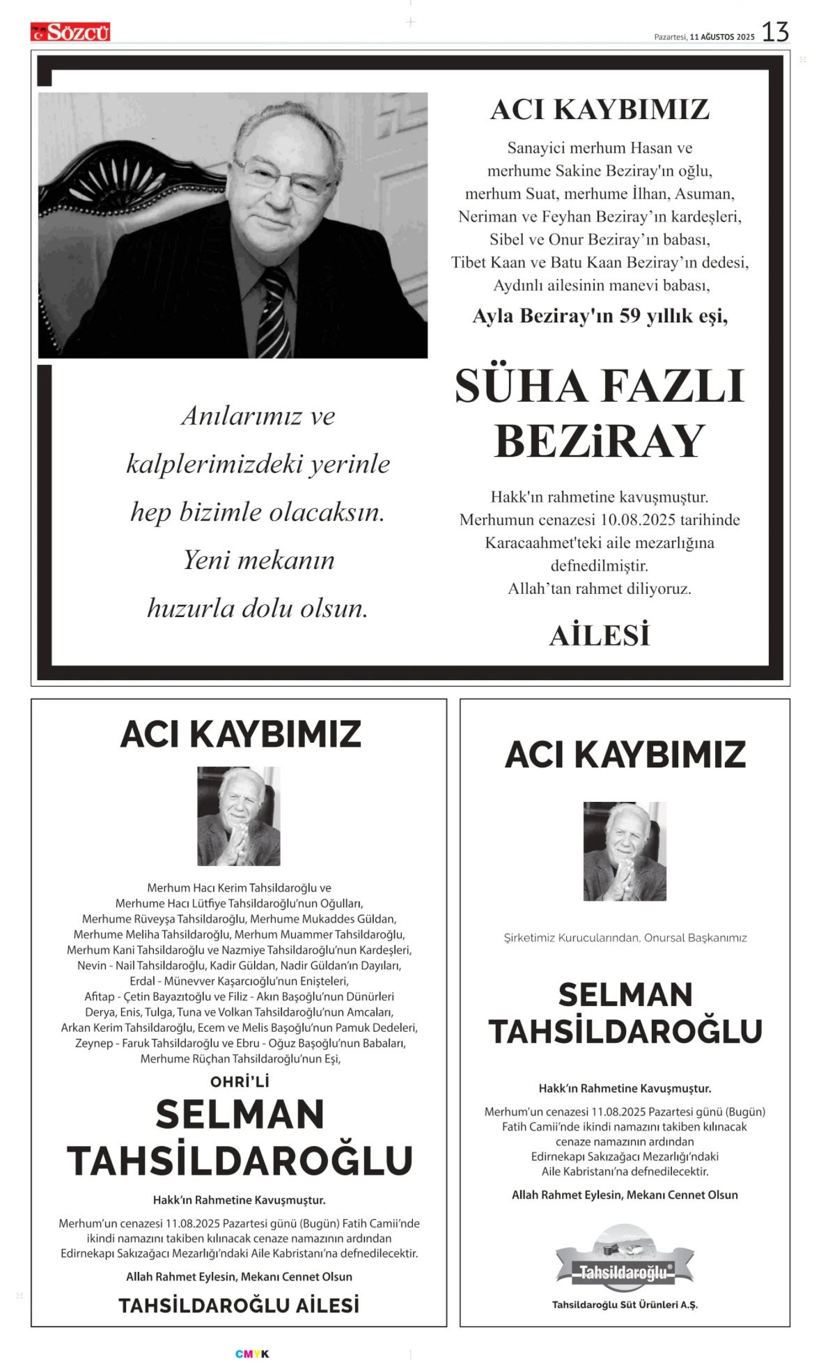 Sözcü Bugünkü Vefat İlanlar 13.8.2025;