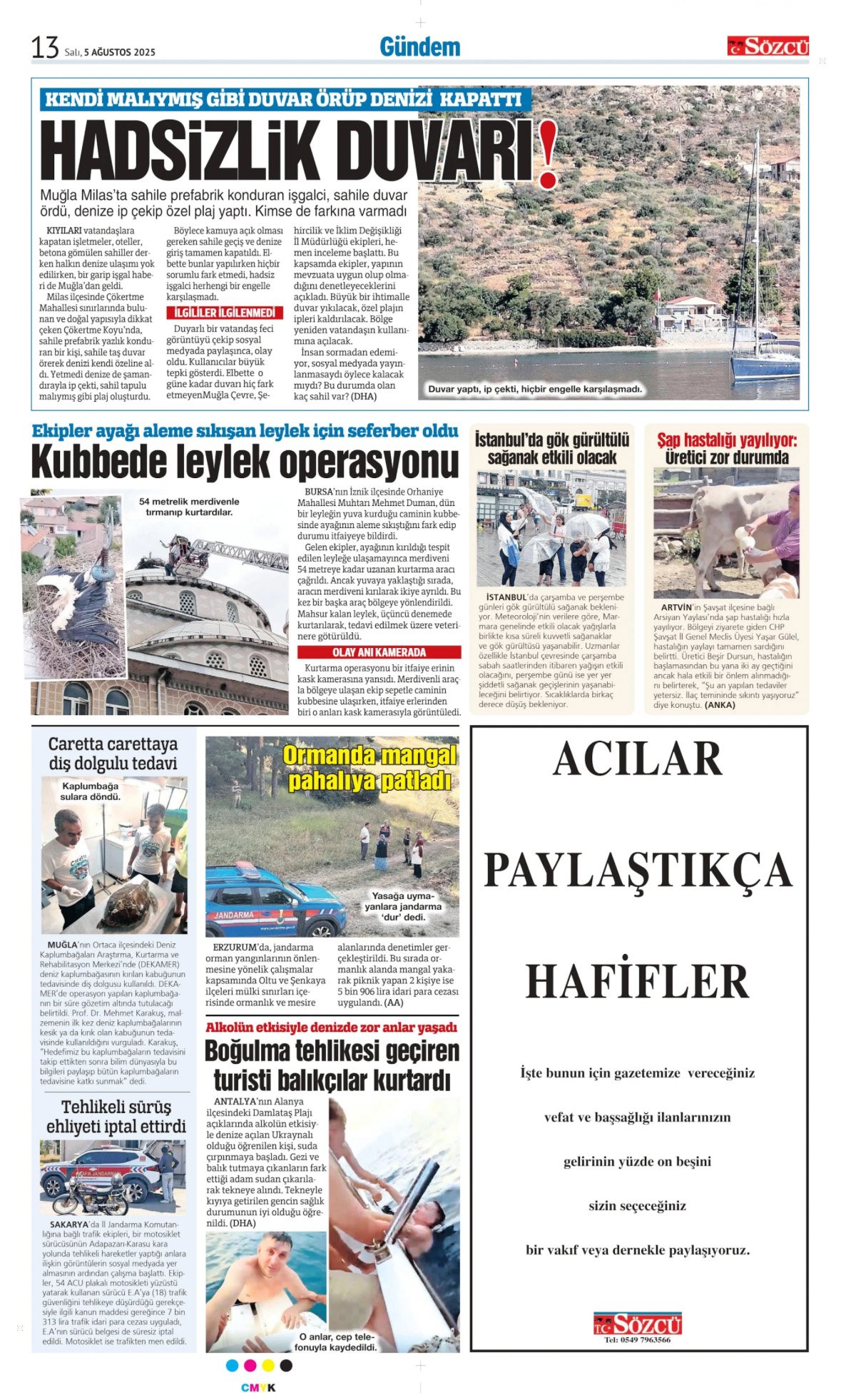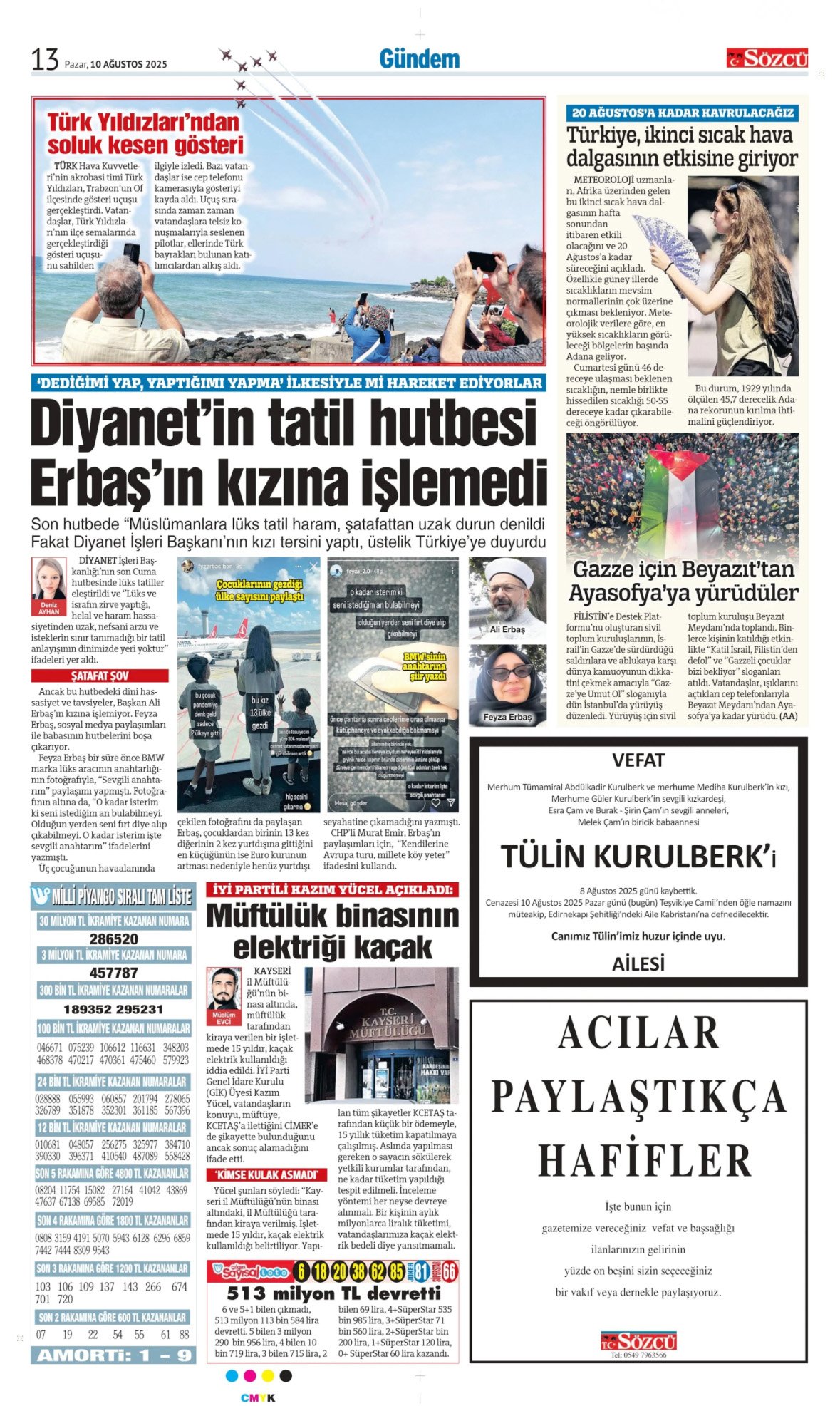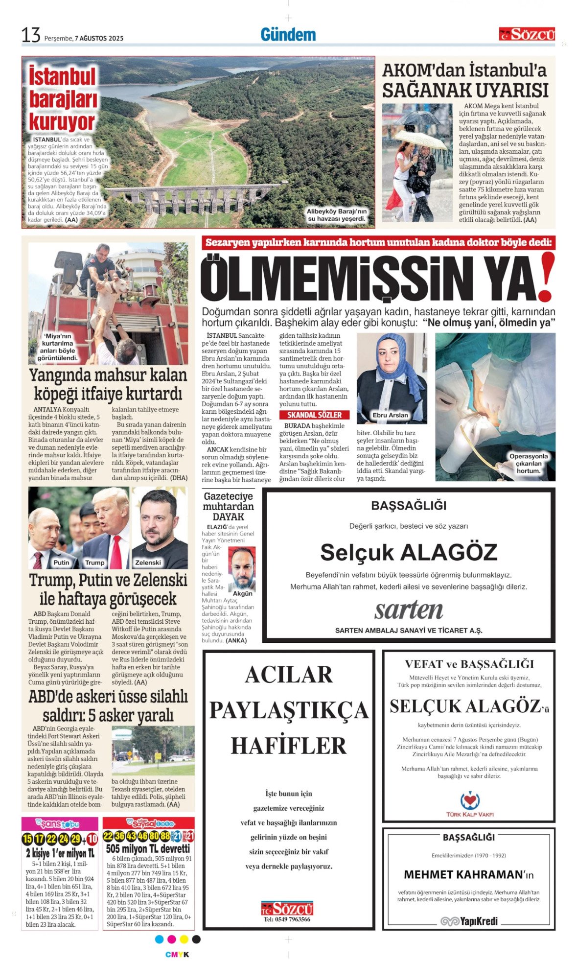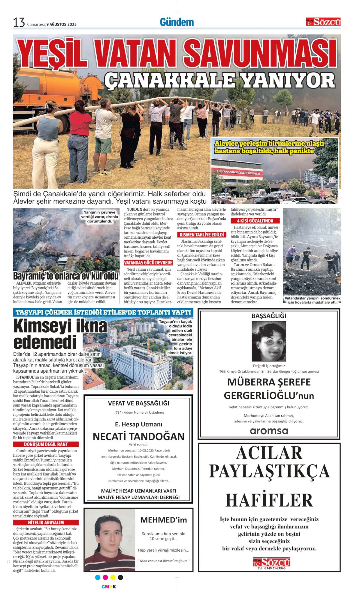 Sözcü Bugünkü Vefat İlanlar 13.8.2025;