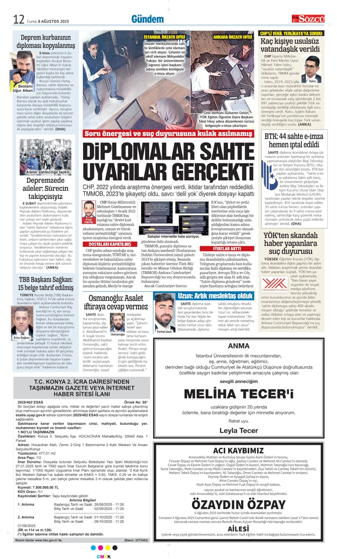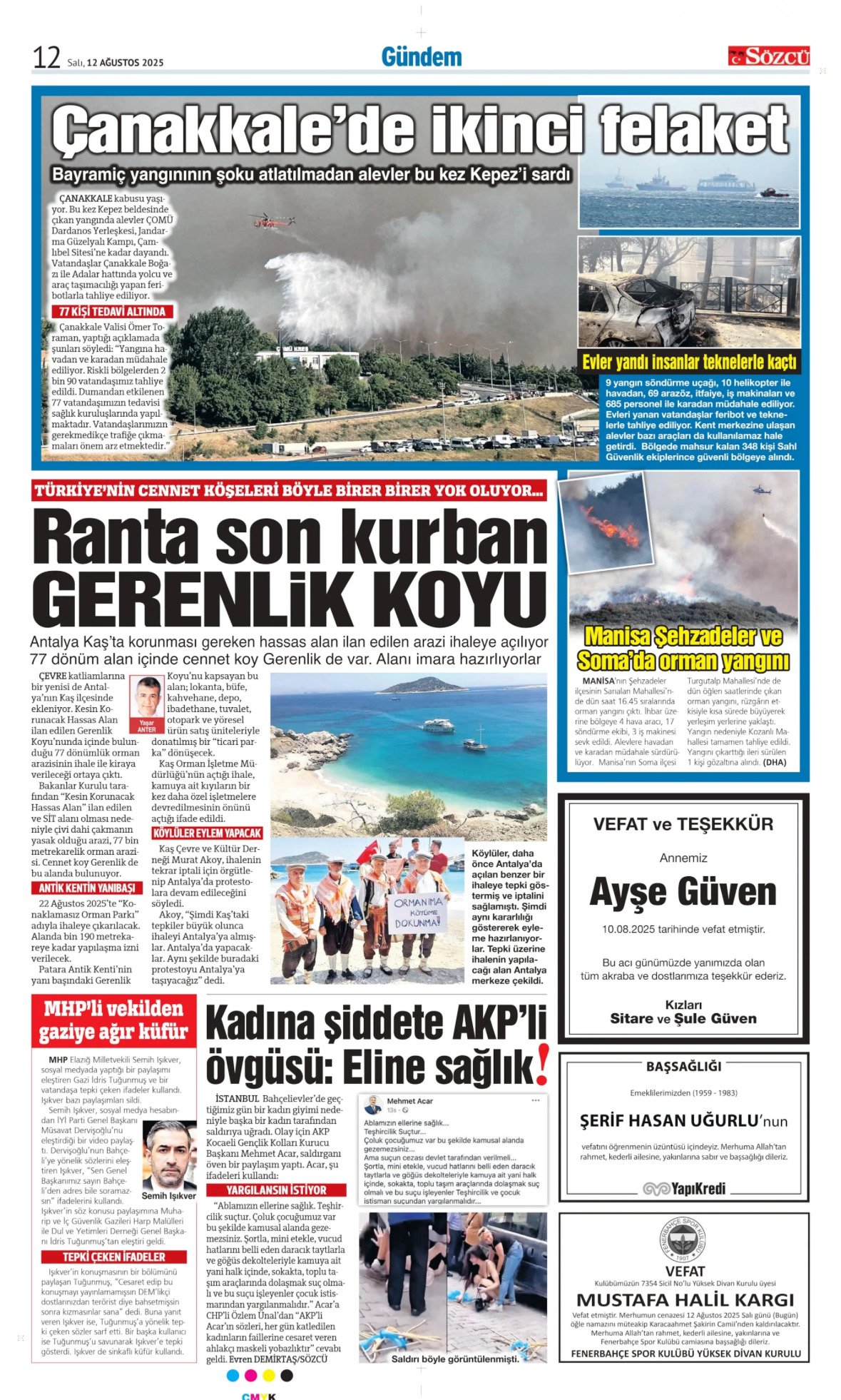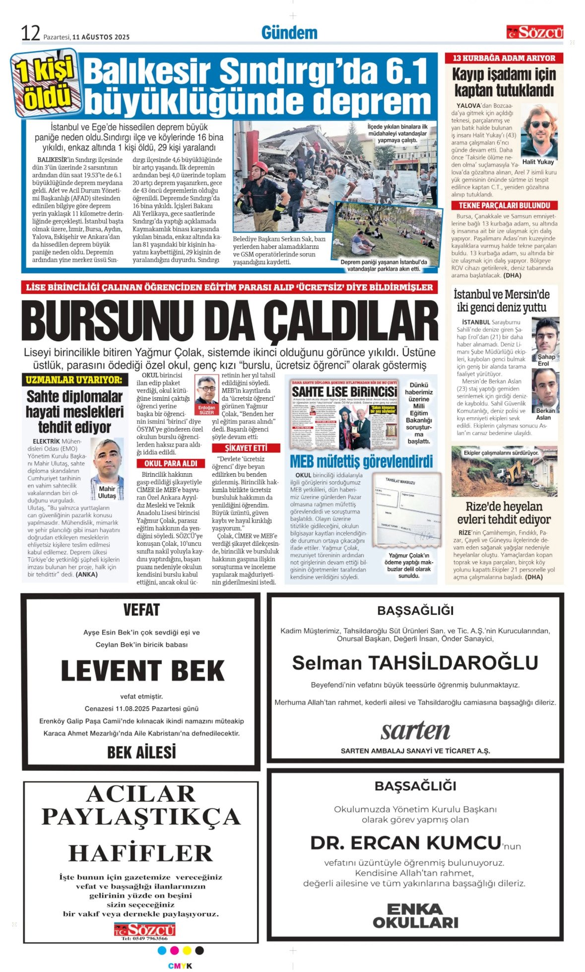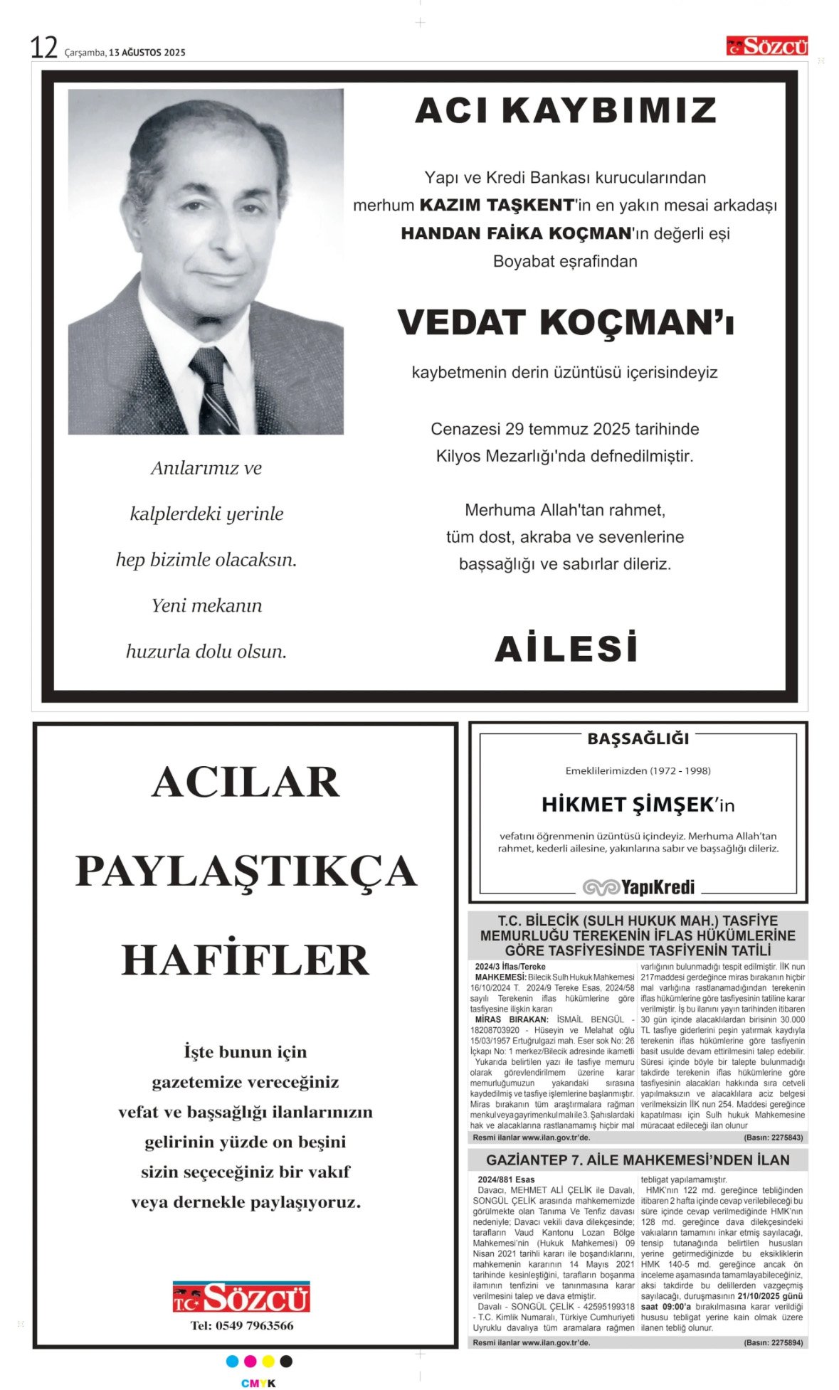 Sözcü Bugünkü Vefat İlanlar 12.8.2025;