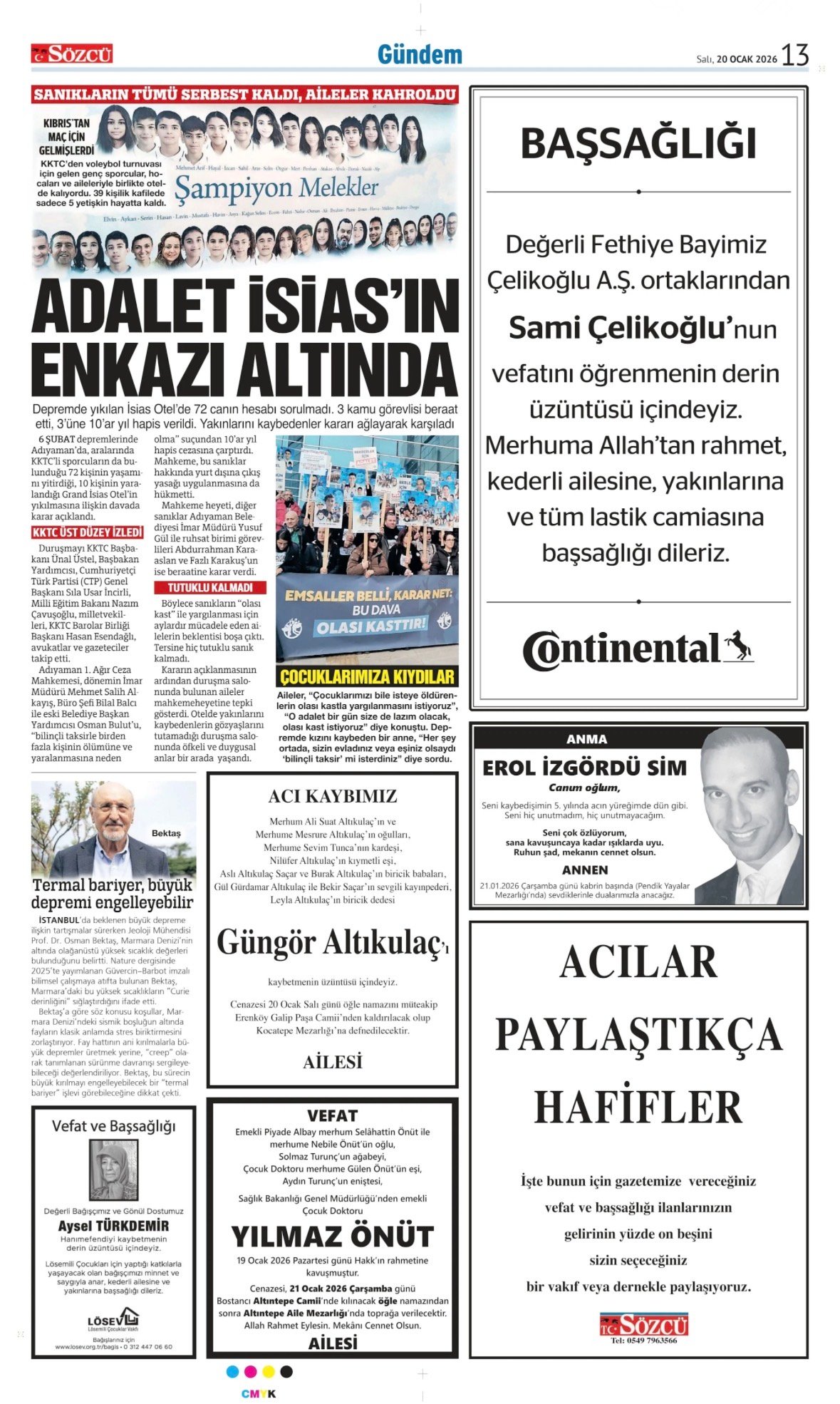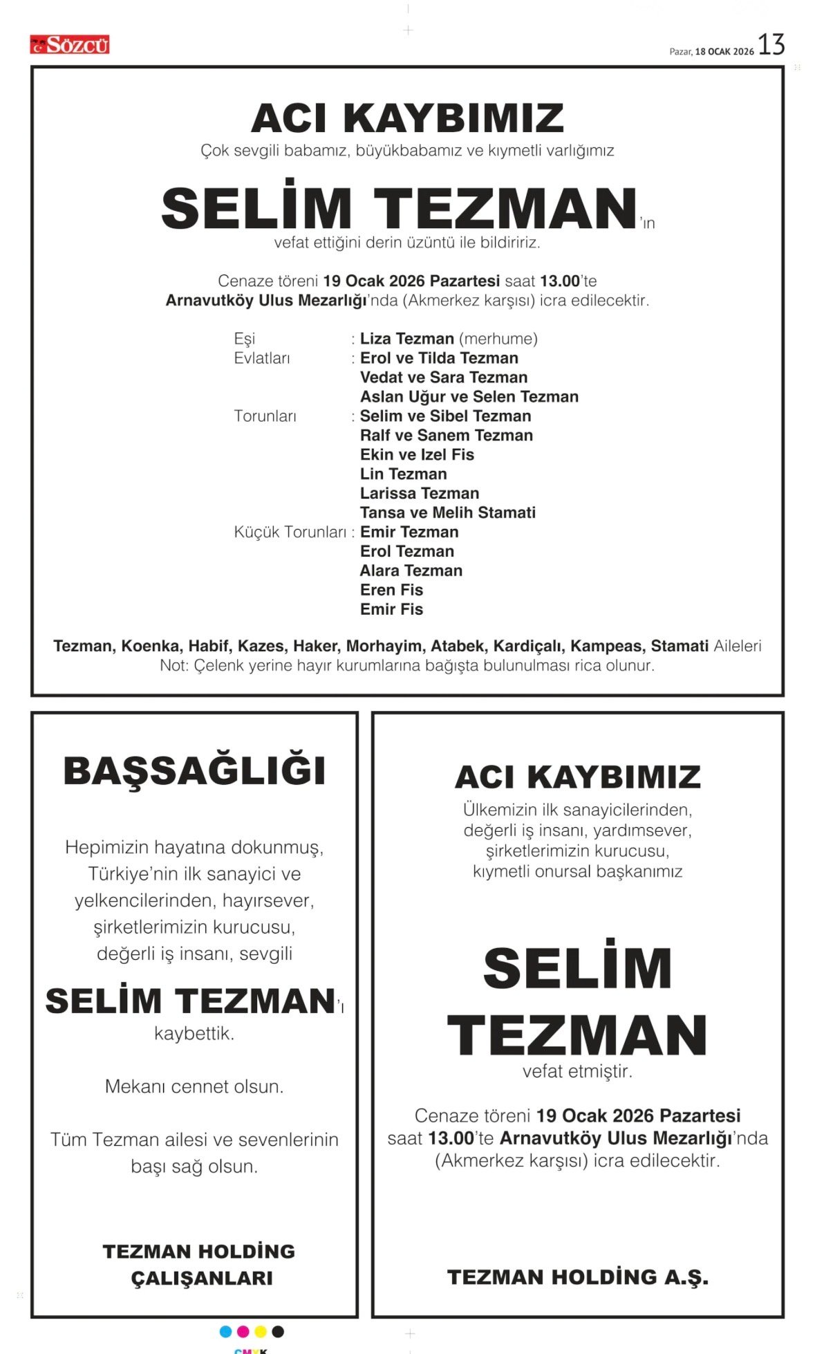 Sözcü Bugünkü Vefat İlan- Başsağlığı İlanı- Anma İlanları ve Arşiv Sayfalar. 13.1.2026